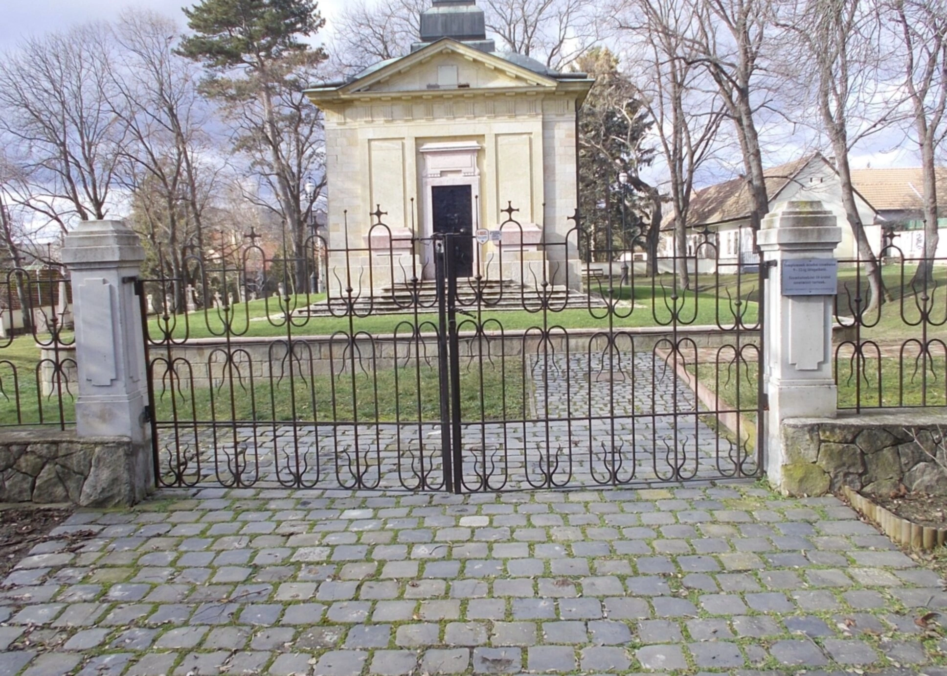 На представленной фотографии запечатлены исторические кованые ворота и вымощенная брусчаткой дорожка, ведущие к православной часовне-усыпальнице благоверной великой княгини Александры Павловны Романовой, расположенной в венгерском селе Урём. За оградой возвышается сама часовня, освящённая во имя святой мученицы царицы Александры. Здание представляет собой прекрасный образец храмовой архитектуры классицизма, увенчанный куполом на высоком барабане и украшенный строгими колоннами, что придаёт всей постройке особую величественность и благолепие.