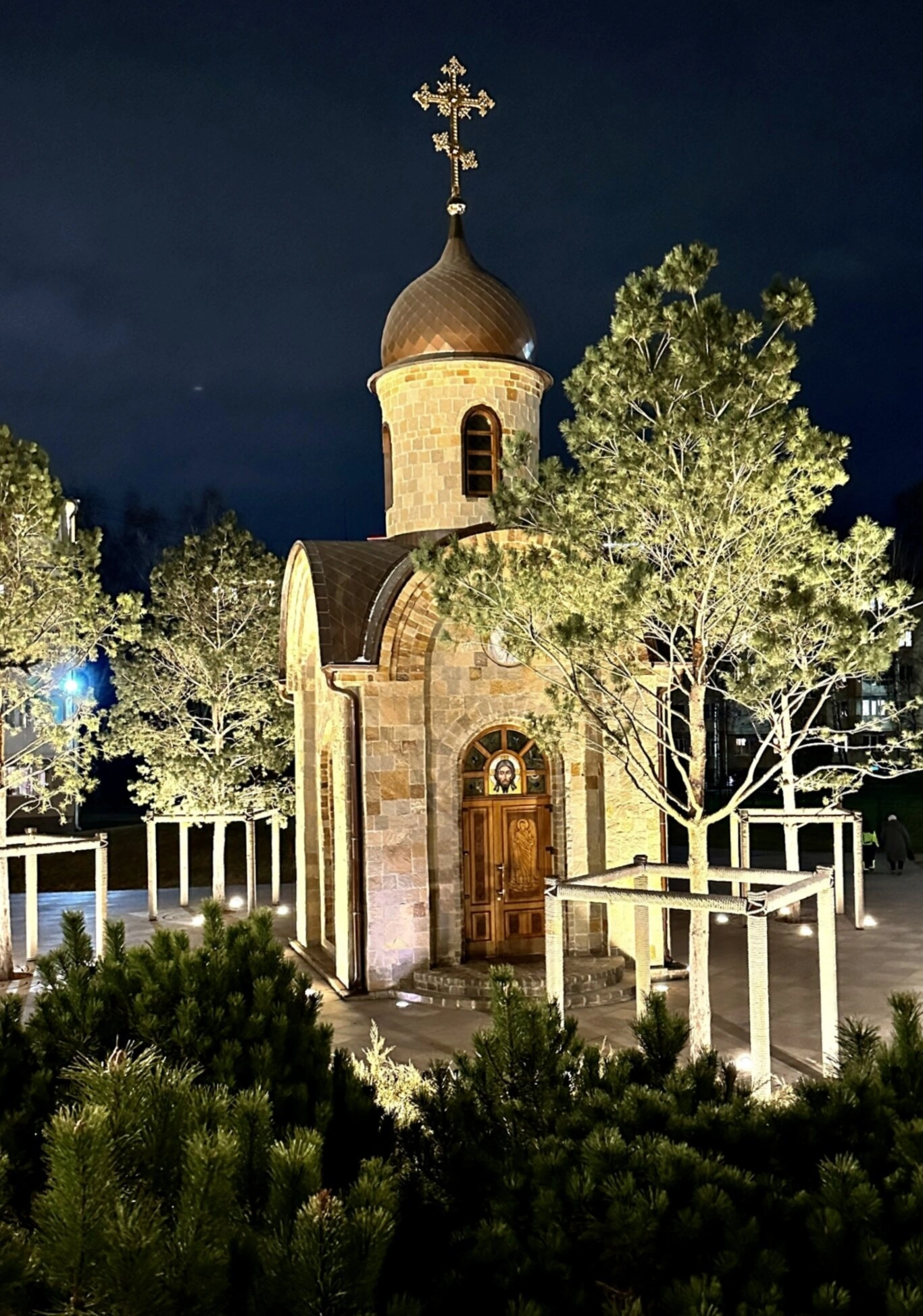 Небольшая каменная часовня, увенчанная золочёным куполом и православным крестом, предстаёт в благоговейной тишине ночи. Искусственная подсветка снизу мягко высвечивает её чистые линии и тёплый камень, создавая ощущение неземного свечения и символизируя светлую память об усопших. Вокруг часовни высажены молодые деревья, которые, будучи также подсвеченными, образуют живую аллею памяти, а аккуратный ландшафтный дизайн придаёт месту ухоженный и строгий вид.