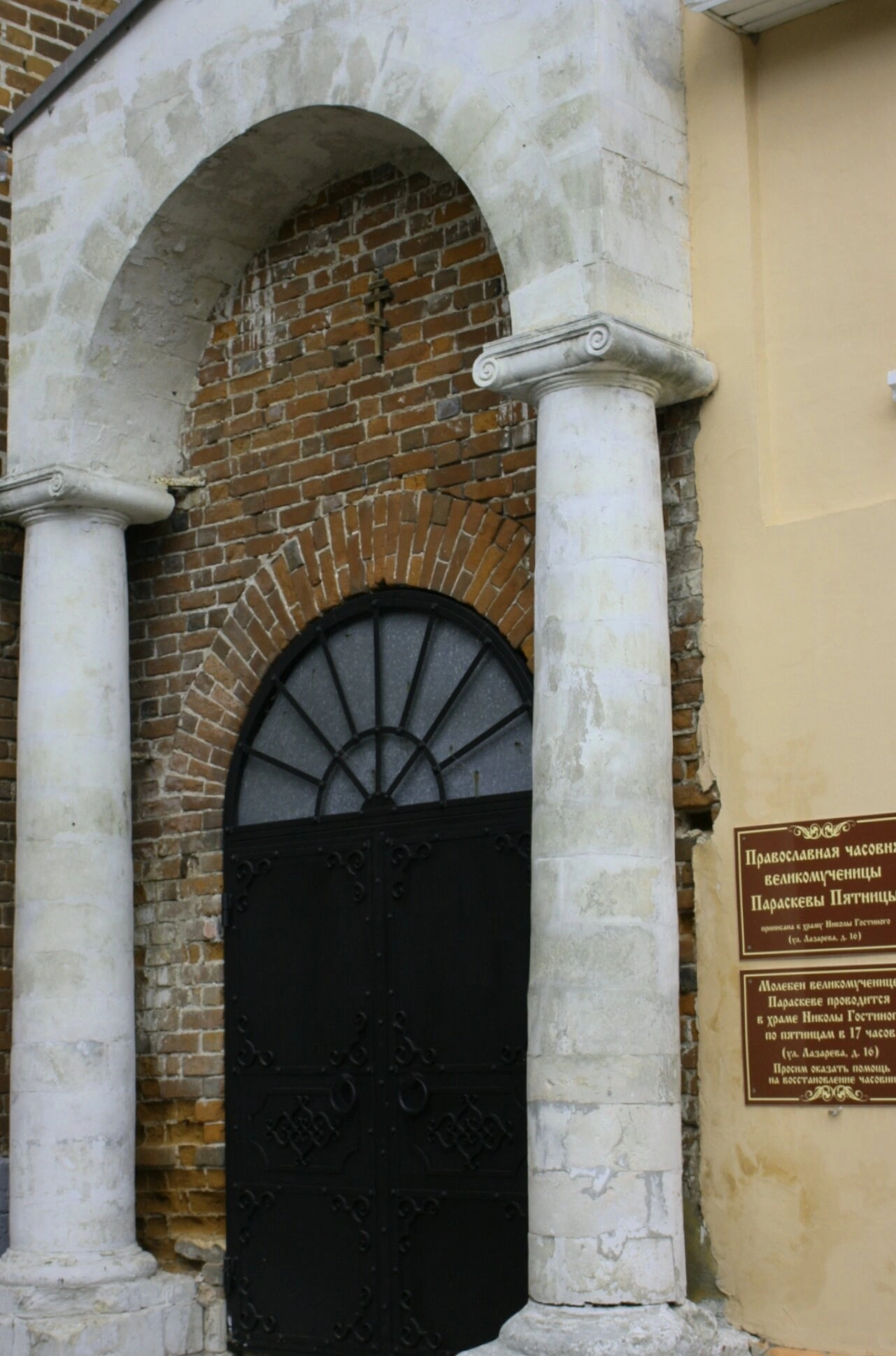 Архитектурный облик часовни, представленный на снимке, отличается благородной строгостью. Вход оформлен в виде арочного проёма, поддерживаемого двумя белоснежными колоннами с изящными ионическими капителями. За аркой видна кирпичная стена с замурованным проёмом, в которой расположена тёмная металлическая дверь, украшенная коваными декоративными элементами. Над дверью размещено полукруглое окно-фрамуга. Рядом с входом на стене укреплена информационная табличка, из которой паломники могут узнать о расписании молебнов, совершаемых по пятницам в 17 часов в храме Николы Гостиного, а также о возможности оказать посильную помощь для содержания часовни.
