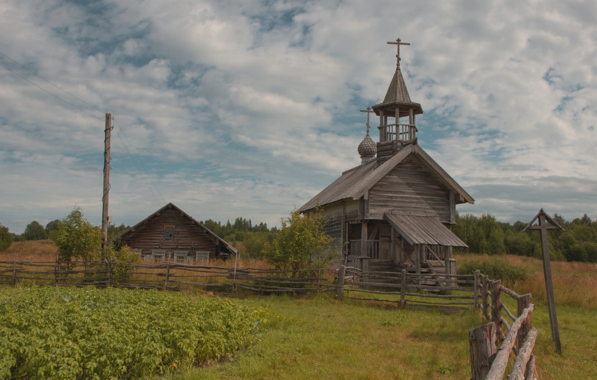 Основным объектом на изображении является сама часовня – классический образец кенозерского храмового зодчества. Здание представляет собой клеть с открытой западной папертью на подклете, перекрытую общей двухскатной крышей самцово-слеговой конструкции. Стены сложены из тёмных от времени бревён, крыша покрыта деревянным лемехом. Над папертью возвышается рубленная «в лапу» шестигранная звонница, увенчанная луковичной главкой с крестом. Слева от часовни видно ещё одно старинное бревенчатое строение, вероятно, жилой дом или хозяйственная постройка. Территорию окружает простой жердевой забор, а на переднем плане расстилается зелёное поле с высокой травой и кустарниками. Справа от часовни установлен деревянный крест. На заднем плане – густой лес и поле, а над всем этим простирается облачное небо с белыми и серыми облаками на голубом фоне.
