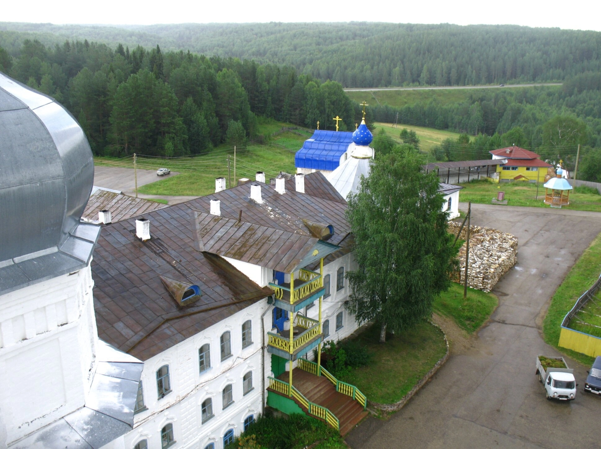 На представленной фотографии запечатлён архитектурный ансамбль Свято-Троицкого Стефано-Ульяновского монастыря, расположенного в селе Ульяново Усть-Куломского района Республики Коми. Снимок сделан с возвышенности, что позволяет охватить единым взором несколько монастырских строений и окружающий их богозданный природный ландшафт.
