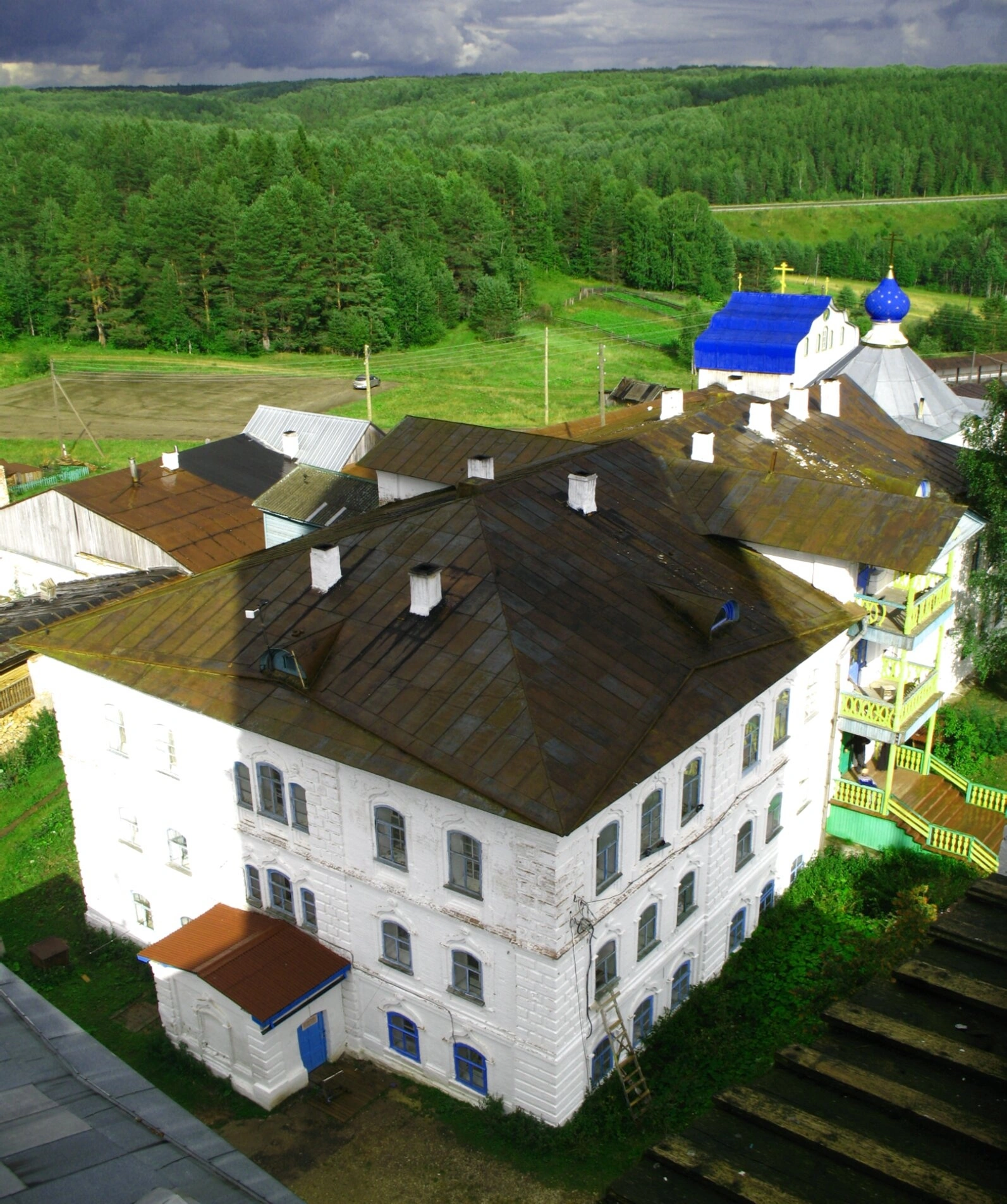 На представленной фотографии запечатлена часовня во имя Живоносного источника Божией Матери с помещением для пожарного обоза, расположенная на территории Ульяновского Свято-Троицкого Стефановского монастыря в селе Ульяново Усть-Куломского района Республики Коми.