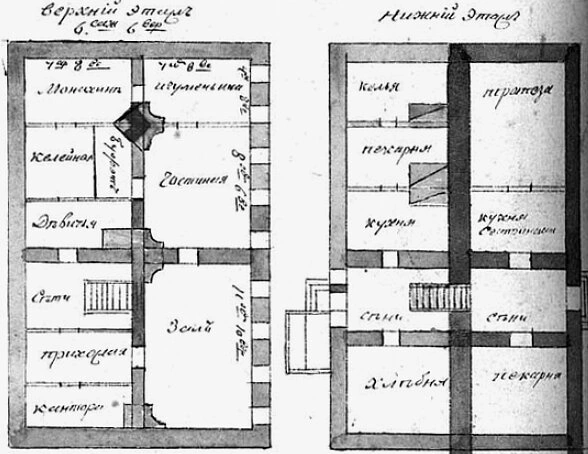 План верхнего этажа включает в себя ряд помещений, предназначенных для проживания сестёр и приёма гостей: келейная, монахиня, сени, прихожая, гостиная, зала, а также кантора и дворницкая. Нижний этаж отведён под хозяйственные нужды: здесь располагались кухня, пекарня, хлебня, погреб и кельи. Наличие помещений с пометками «столы» указывает на трапезные помещения. Подобное расположение отражает традиционное для православных обителей устройство жизни, сочетающее молитвенный труд и хозяйственные послушания.