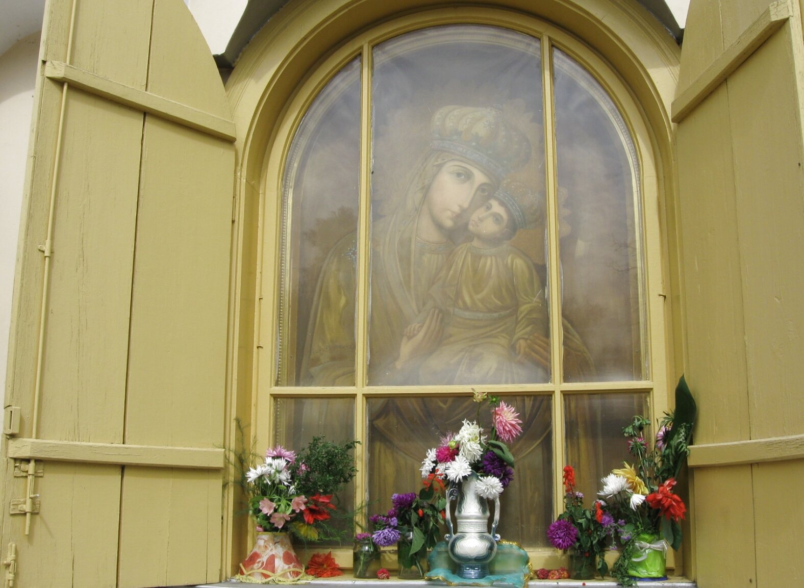 На представленной фотографии запечатлена чтимая икона Пресвятой Богородицы, пребывающая в Свято-Троицком ставропигиальном женском монастыре города Корец. Святыня размещена в арочной нише, обрамлённой деревянными ставнями жёлтого цвета, которые распахнуты, открывая взору верующих образ Царицы Небесной.