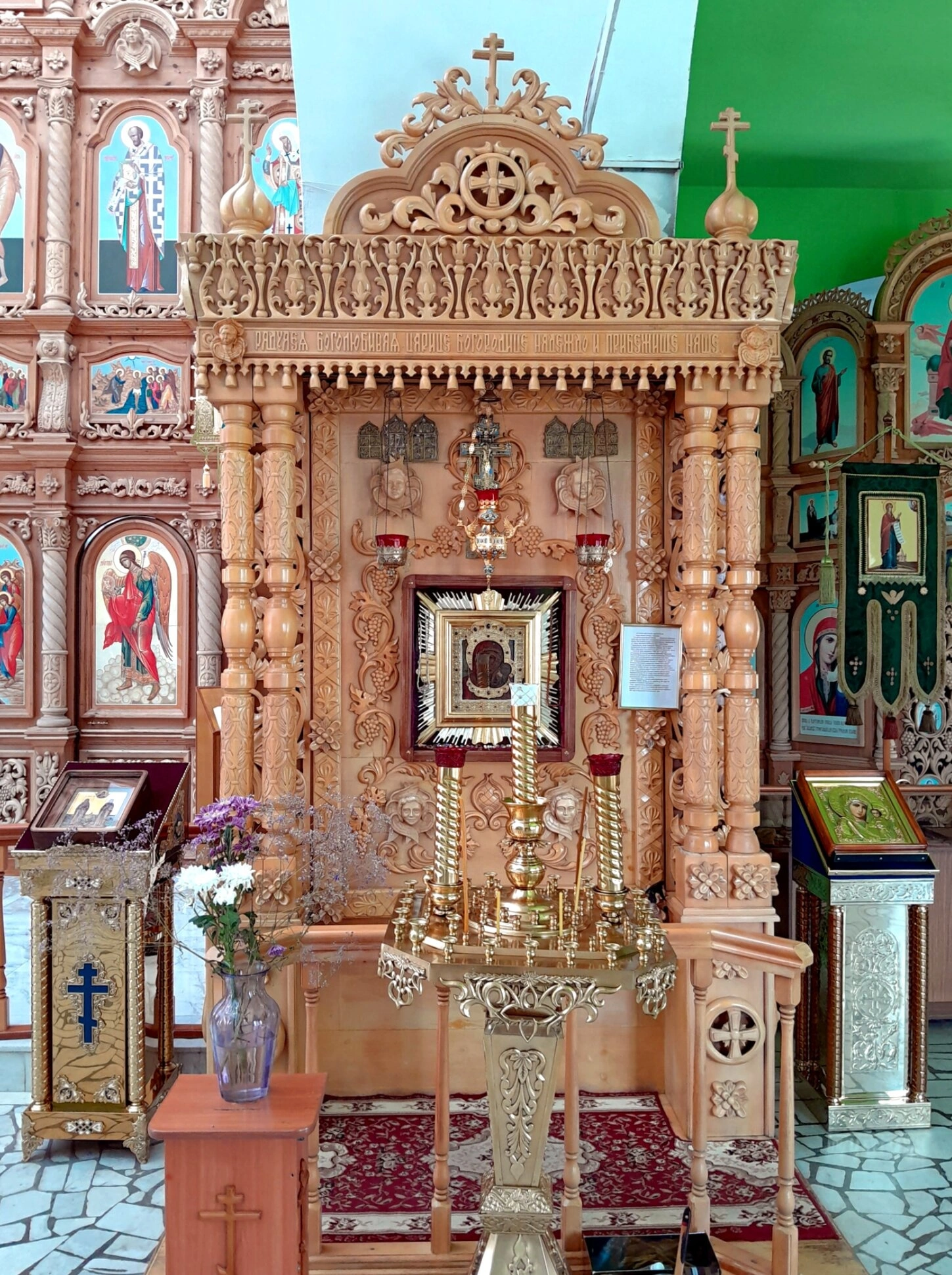 Многоярусный иконостас, выполненный из дерева с искусной резьбой, демонстрирует традиционное для православной церковной архитектуры строение. Иконы, расположенные в строгом порядке, представляют собой священную летопись и воплощение догматов веры. Перед святыми образами установлены подсвечники, на которые верующие возлагают свои свечи во время молитвы.