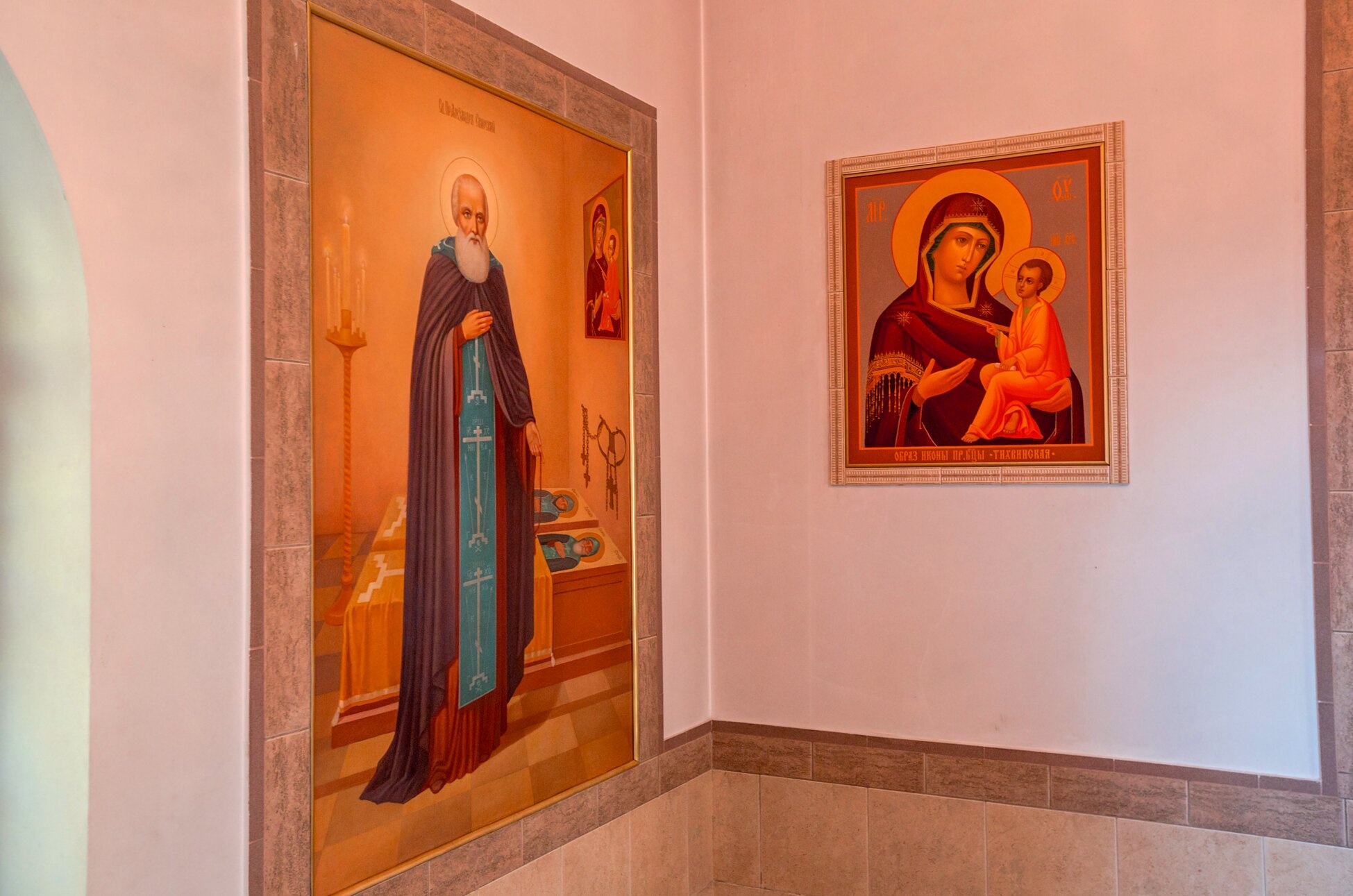 Каменные стены, на которых размещены святые образа, и аскетичная обстановка помещения свидетельствуют о древности и намоленности этой территории, приглашая верующих к сосредоточенной молитве и созерцанию.