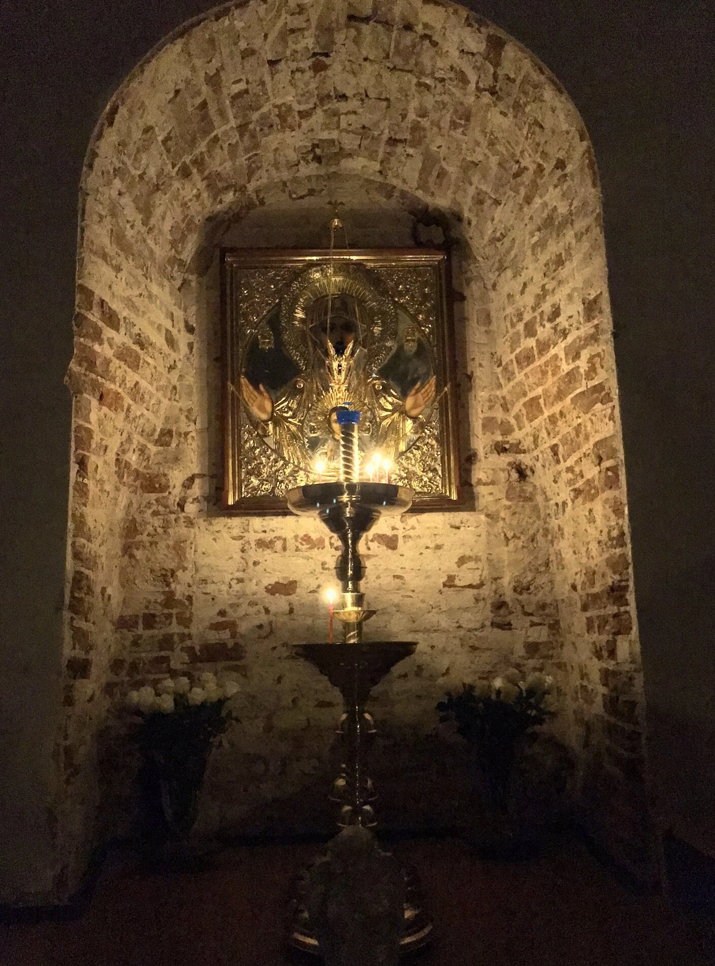 На представленной фотографии запечатлена чтимая икона Пресвятой Богородицы, именуемая «Знамение», пребывающая в храме в честь иконы Божией Матери «Знамение» в селе Раёк Тверской области. Священное изображение помещено в специальную кирпичную нишу, оформленную в виде арочного кивория, что подчёркивает особое благоговение и почитание, оказываемое этому образу.