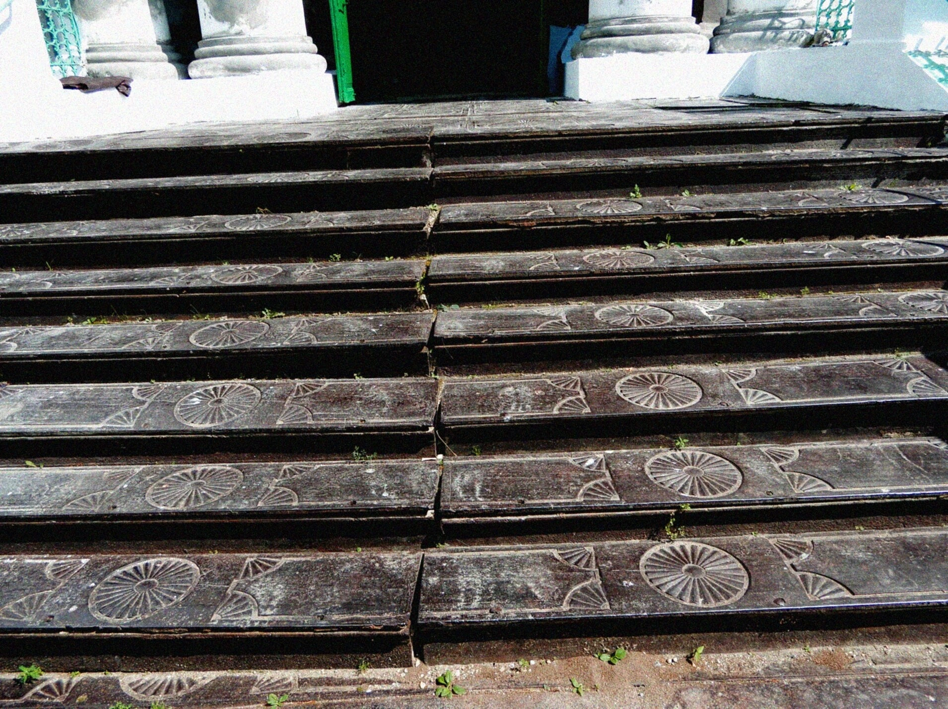 На представленной фотографии запечатлена уникальная чугунная лестница, ведущая ко входу в храм во имя Святителя Николая Чудотворца в старинном уральском селе Быньги. Это выдающийся образец художественного литья, характерного для уральских мастеров XIX столетия. Каждая ступень лестницы отлита из чугуна и украшена сложным рельефным орнаментом, включающим геометрические фигуры и стилизованные розетки, символизирующие духовное просвещение и нетварный Свет.