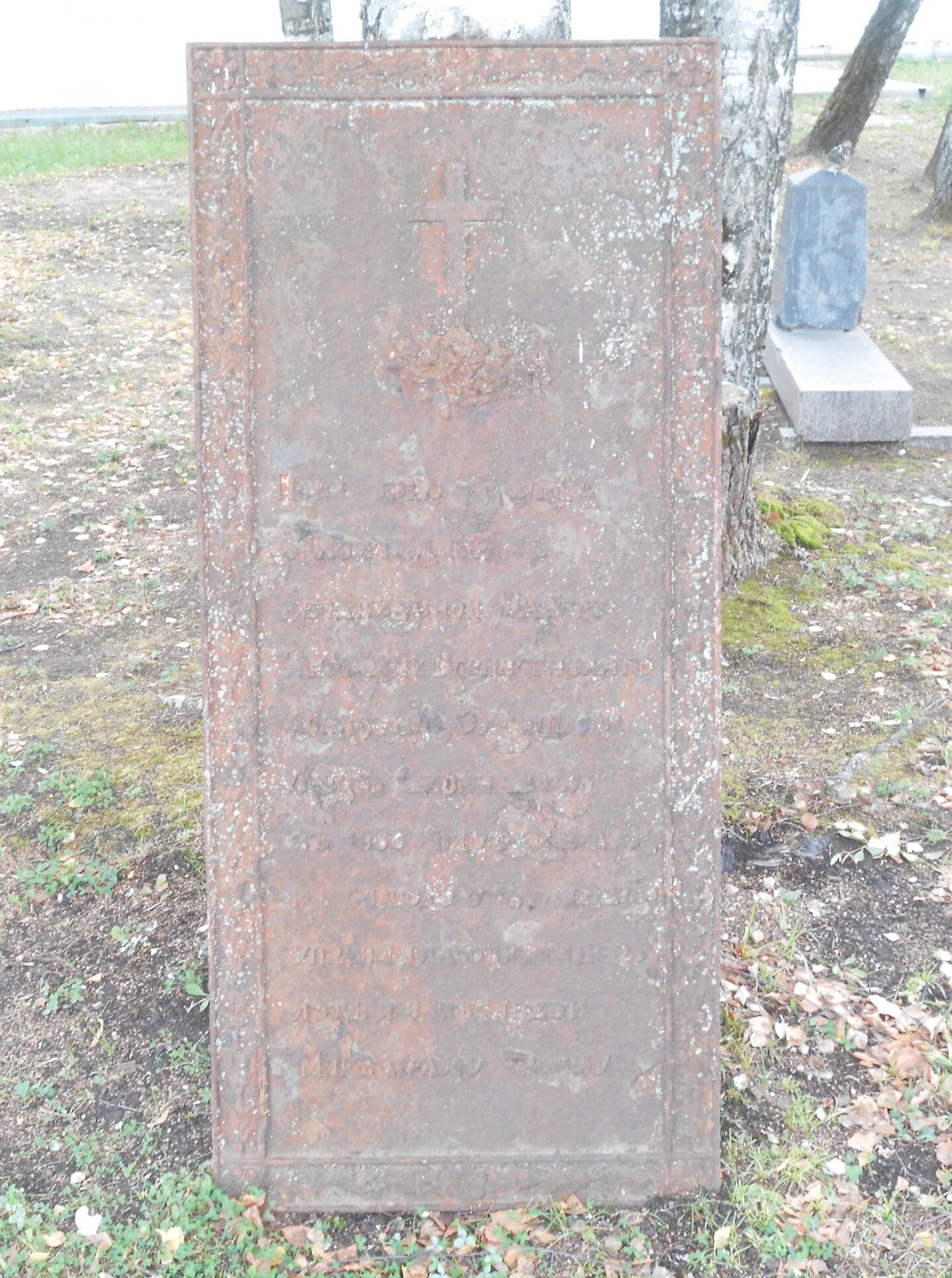 На представленной фотографии запечатлена старинная чугунная надгробная плита, находящаяся на территории некрополя Вознесенского женского монастыря в городе Смоленске. Плита, установленная в качестве вертикального памятника, имеет выраженные следы длительного воздействия времени: поверхность её основательно повреждена коррозией, что является характерной особенностью сохранности подобных металлических артефактов под открытым небом.