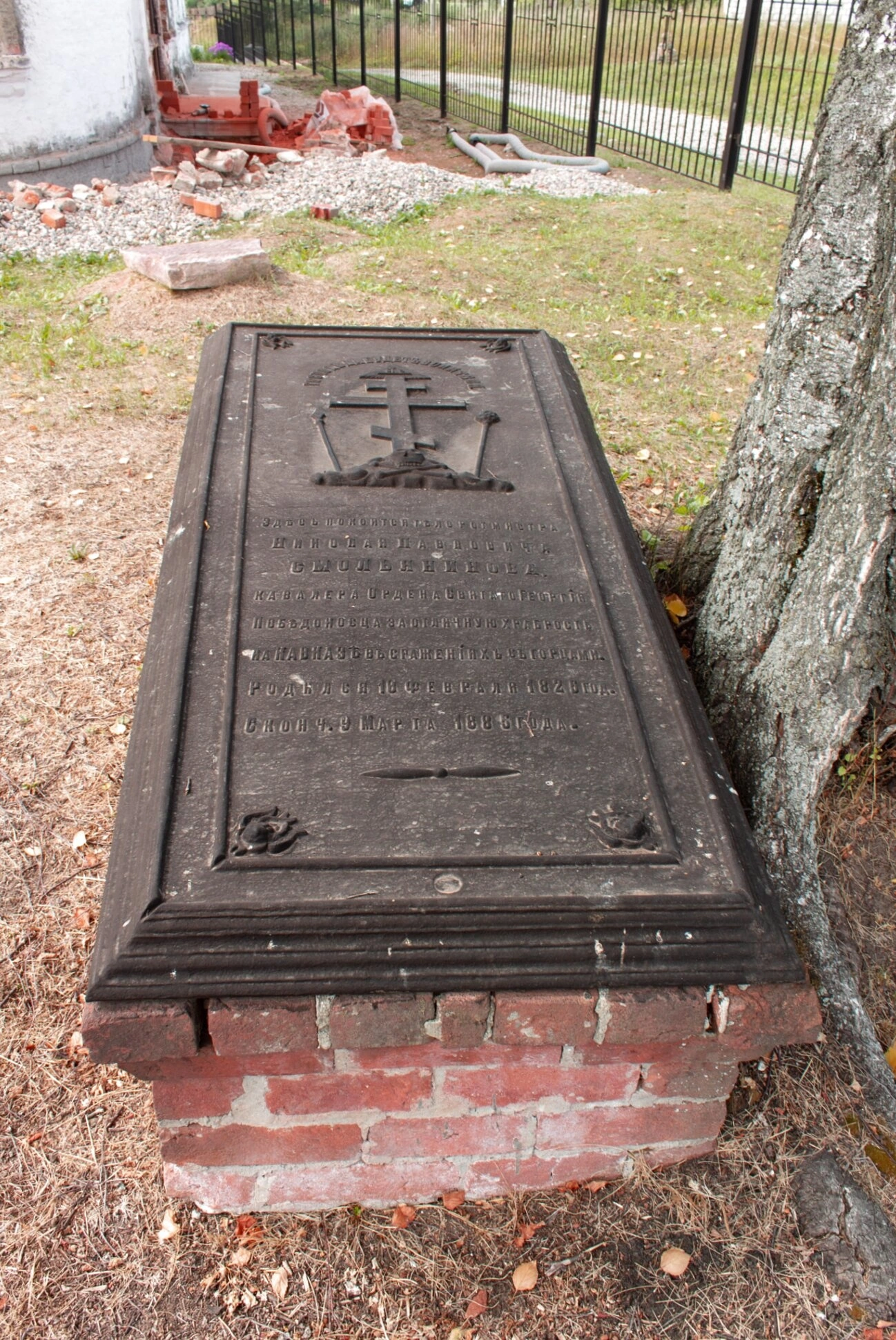 Плита установлена на невысоком кирпичном постаменте в непосредственной близости от векового дерева. На заднем плане просматривается часть белоснежного здания церкви и ажурная металлическая ограда, окружающая храмовую территорию. Местоположение захоронения у стен православного храма подчёркивает особое почитание усопшего и соответствует традициям церковного погребения.