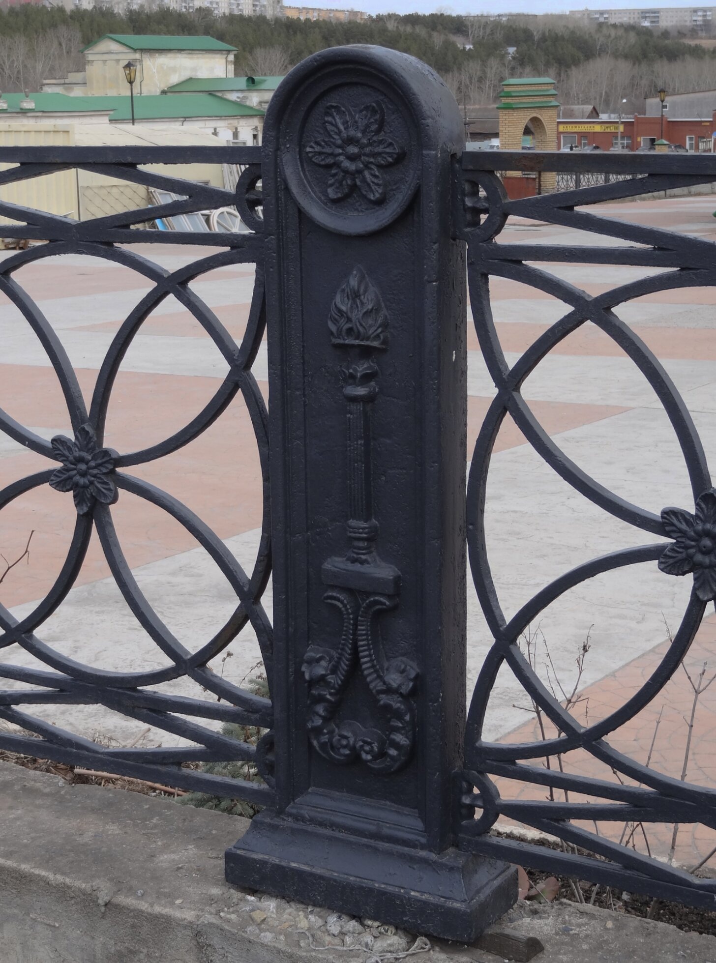 В верхней части стойки размещено стилизованное изображение цветка, символизирующего духовную чистоту и процветание. Ниже расположен рельефный факел, олицетворяющий свет веры, просвещающий мир и ведущий православных христиан по пути спасения. Основание декорировано изящными завитками и акантами, демонстрирующими высокое мастерство уральских литейщиков.