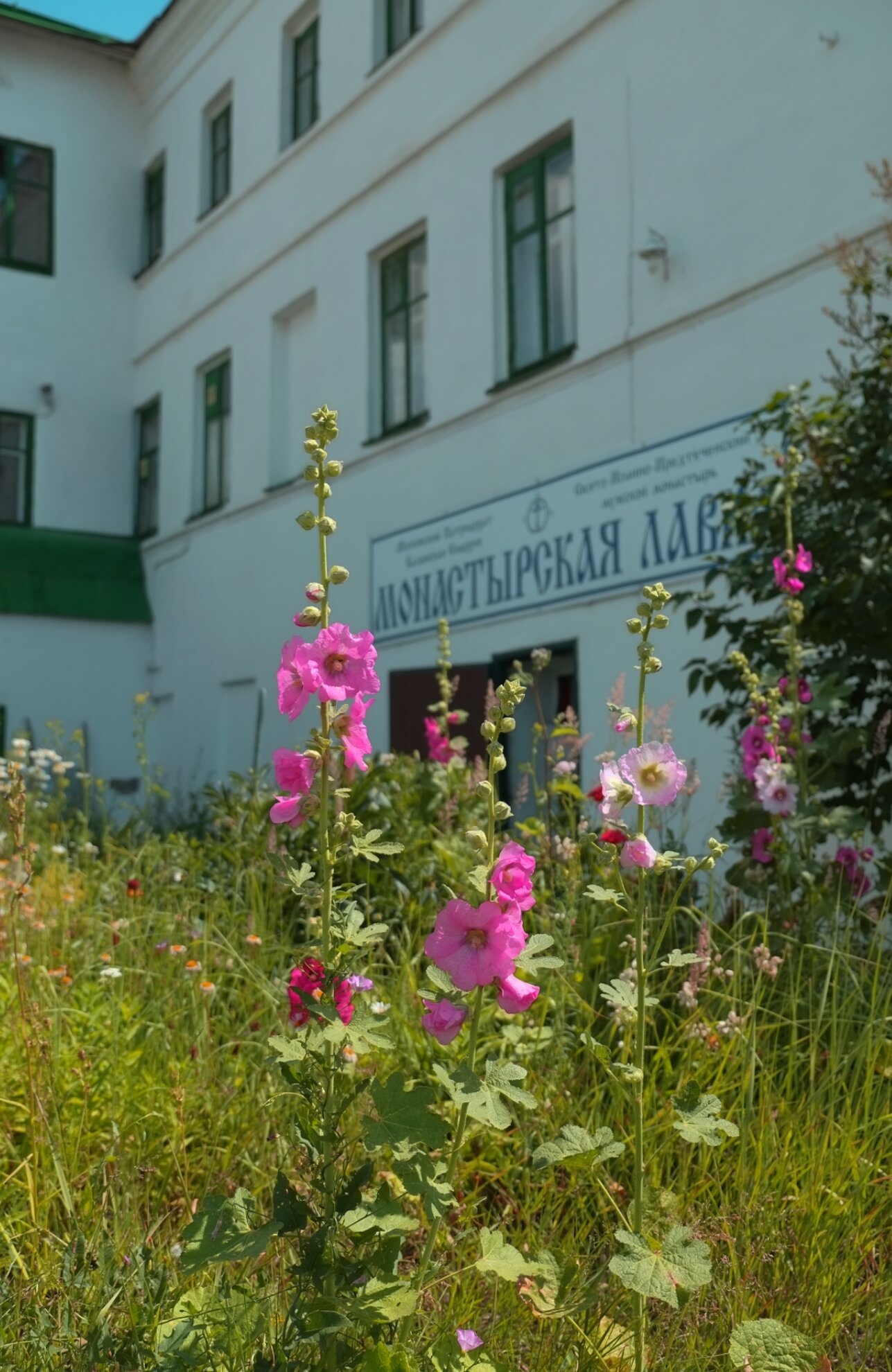 Перед зданием разбит ухоженный участок с зелёной травой и яркими цветущими растениями. Среди обильной зелени особенно выделяются высокие розовые цветы, напоминающие благоухающие шток-розы (мальвы). Эти цветы традиционно украшают многие монастырские сады России, символизируя духовную красоту и райское блаженство.