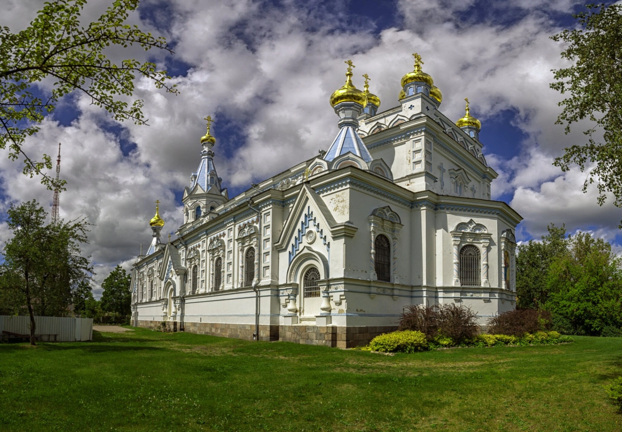 На фотографии запечатлён величественный Даугавпилсский кафедральный собор во имя святых страстотерпцев Бориса и Глеба — главный православный храм города Даугавпилса и крупнейший православный собор на всей территории Латвии. Этот духовный центр способен вместить под своими сводами до пяти тысяч верующих, собирающихся на совместную молитву.