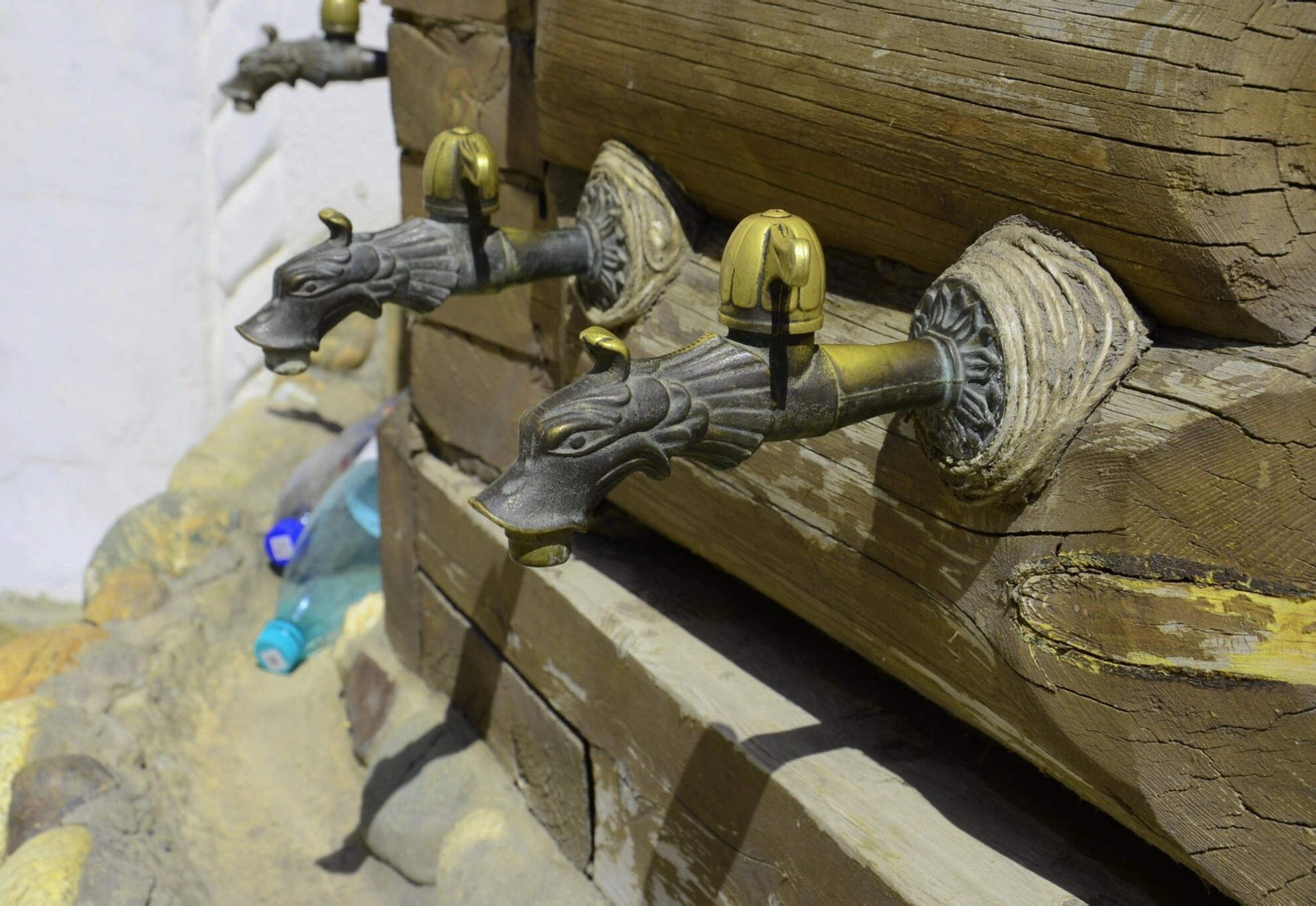 На представленной фотографии запечатлены декоративные элементы источника, находящегося на территории храма в честь преподобного Серафима Саровского в городе Анапа. Два водопроводных крана выполнены в художественной форме, напоминающей головы мифических существ, возможно, драконов или грифонов, что является традиционным мотивом в церковном декоративно-прикладном искусстве.