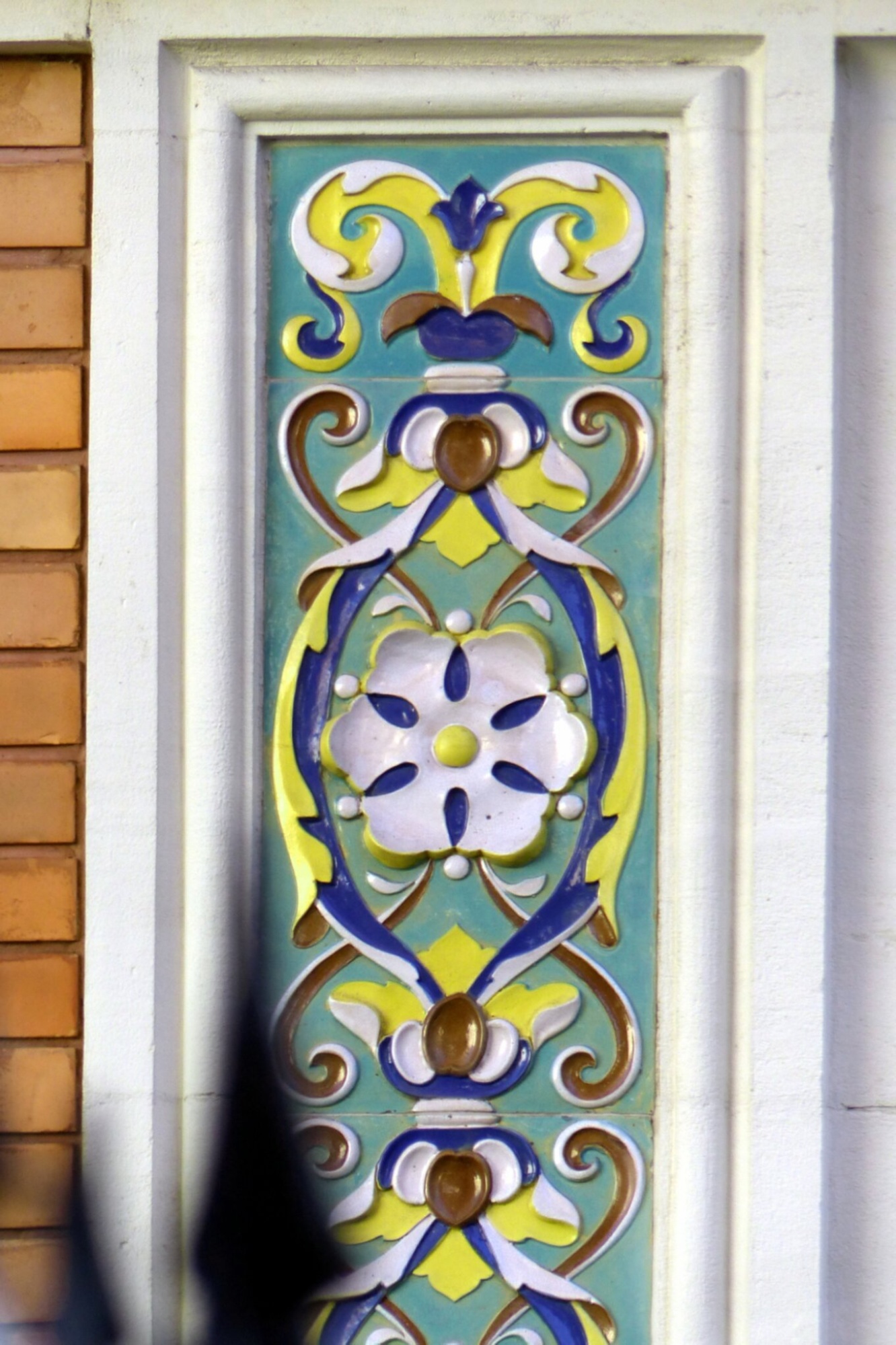 На представленной фотографии запечатлён фрагмент изразцового декора, украшающего Собор Святого Николая Чудотворца — кафедральный собор Венской и Австрийской епархии Русской Православной Церкви. Декоративная керамическая плитка, выполненная в традиционной португальской технике азулежу, служит элементом благолепного убранства внешнего облика святыни.