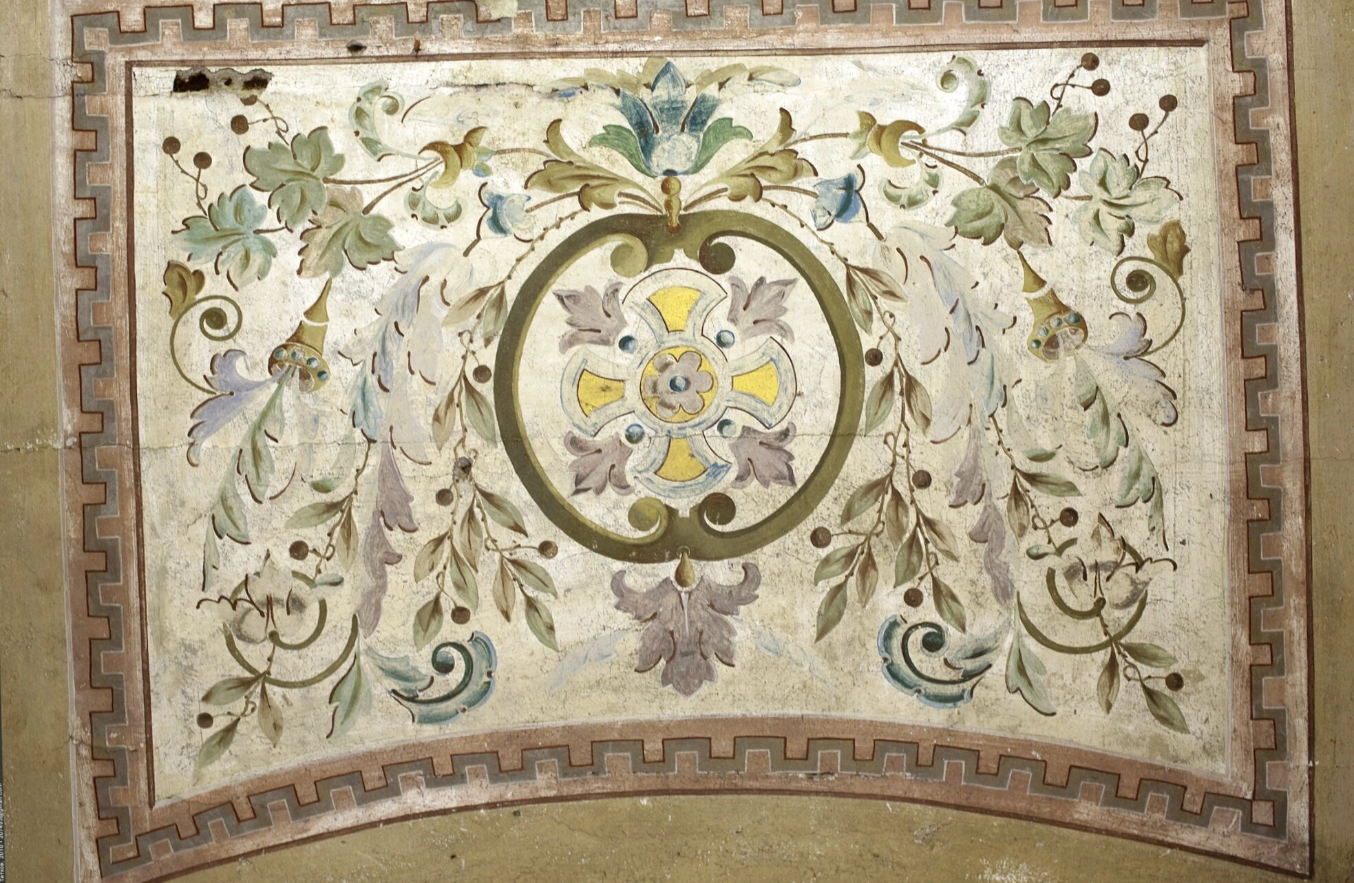 Композиционным центром росписи выступает круглый медальон, обрамлённый тёмно-зеленым кольцом. Внутри медальона помещён крестообразный узор, выполненный в золотистых и светлых тонах, что символизирует животворящий Крест Господень — главный символ христианского спасения. От центрального медальона симметрично расходятся изящные ветви, обильно украшенные стилизованными листьями и цветами. Палитра растительного орнамента разнообразна и включает в себя различные оттенки зелёного, коричневого, синего и фиолетового цветов.