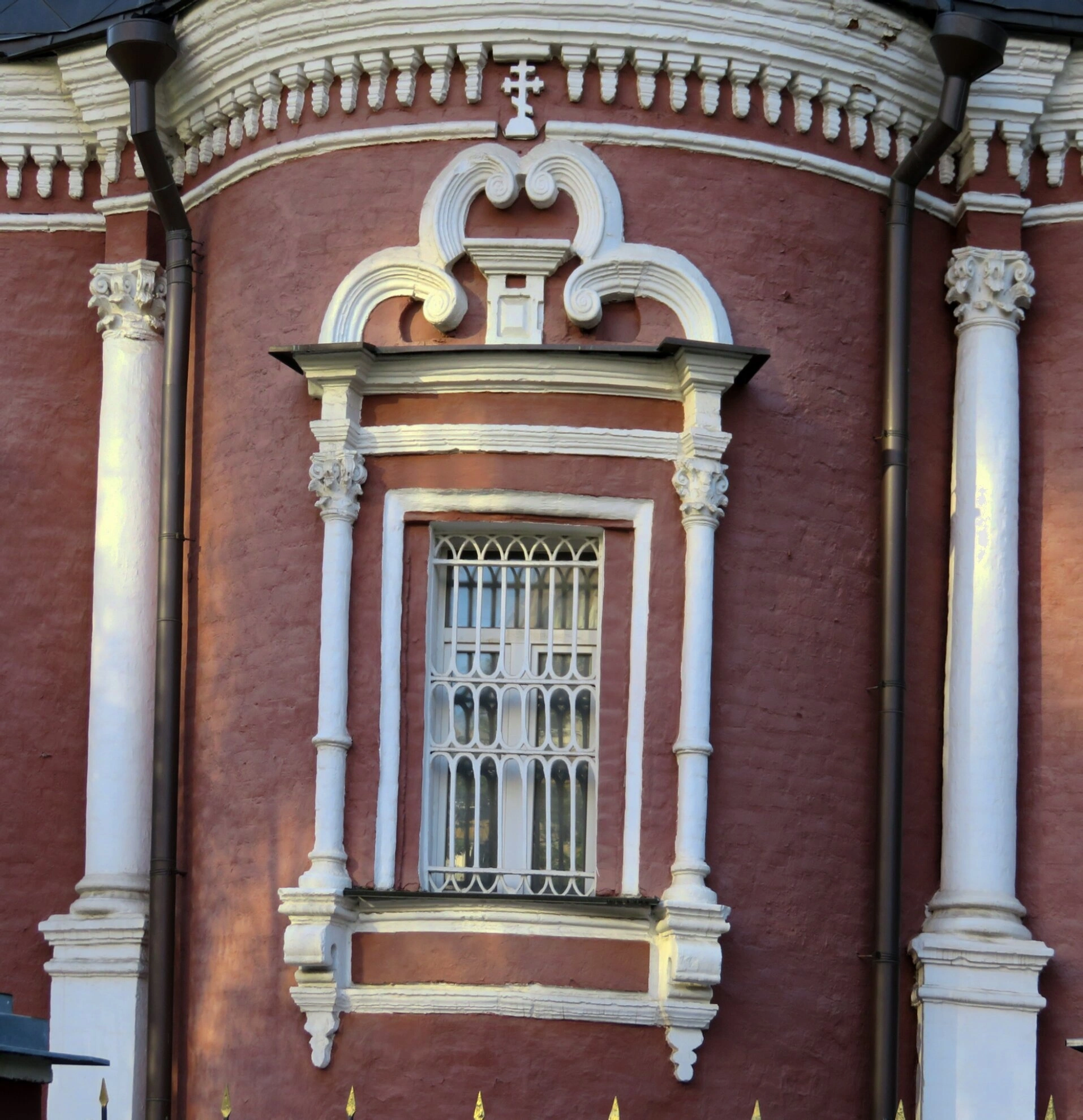 Над оконным проёмом размещён сложный лепной картуш, увенчанный православным крестом, что подчёркивает сакральное назначение сооружения. Фасад храма, выполненный из красного кирпича, символизирует жертвенную кровь Спасителя, а белокаменные декоративные элементы олицетворяют чистоту и святость. Подоконник имеет фигурное оформление, что свидетельствует о внимании зодчих к каждой детали богоугодного строения.