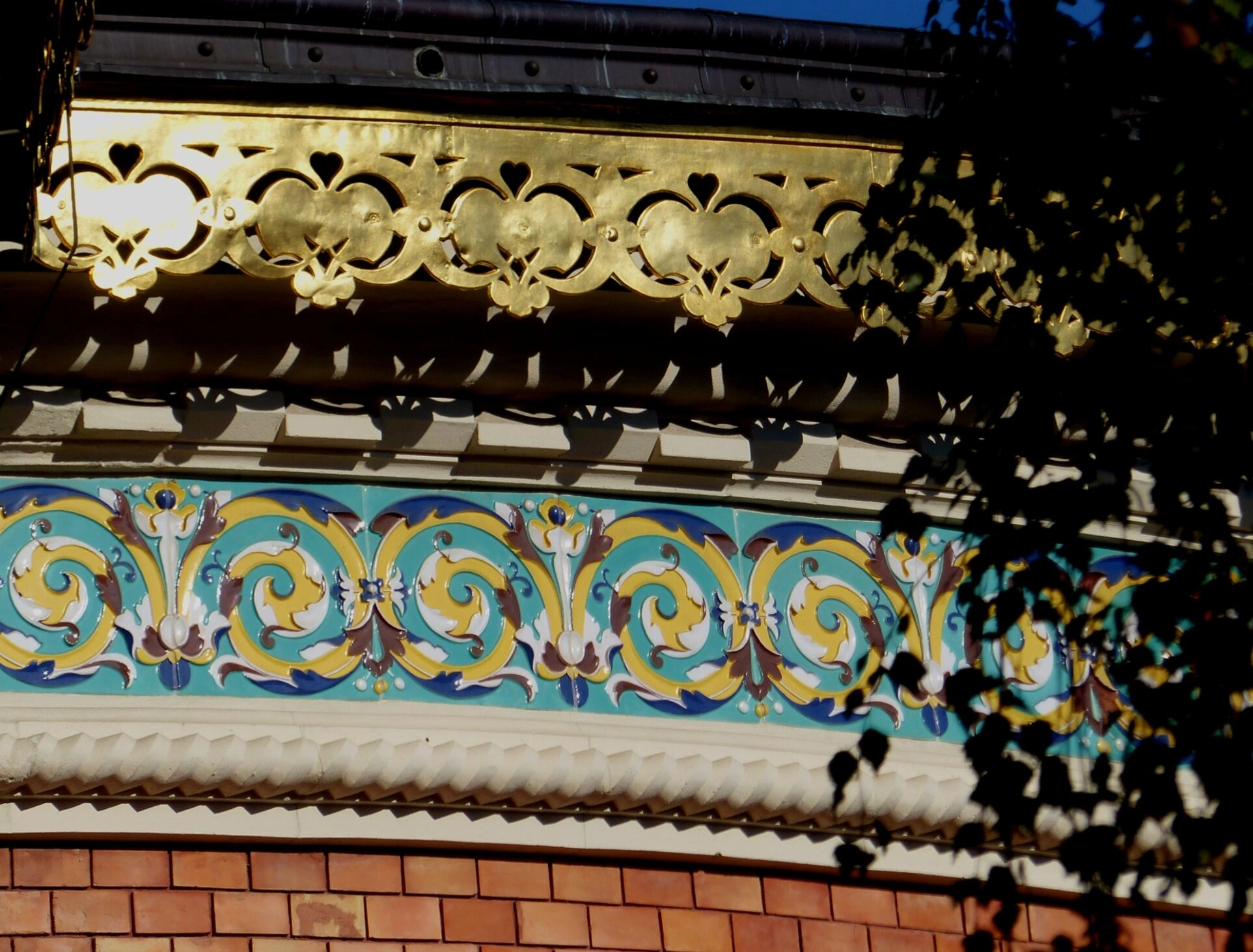 В верхней части снимка явственен золочёный декоративный элемент, исполненный с тонким искусством. Ажурный узор, сочетающий в себе стилизованные сердечки и изящные завитки, напоминает о традициях древнерусского зодчества и придаёт зданию торжественный, праздничный вид. Этот сияющий акцент символически указывает на красоту горнего мира и устремлённость верующих к небесам.
