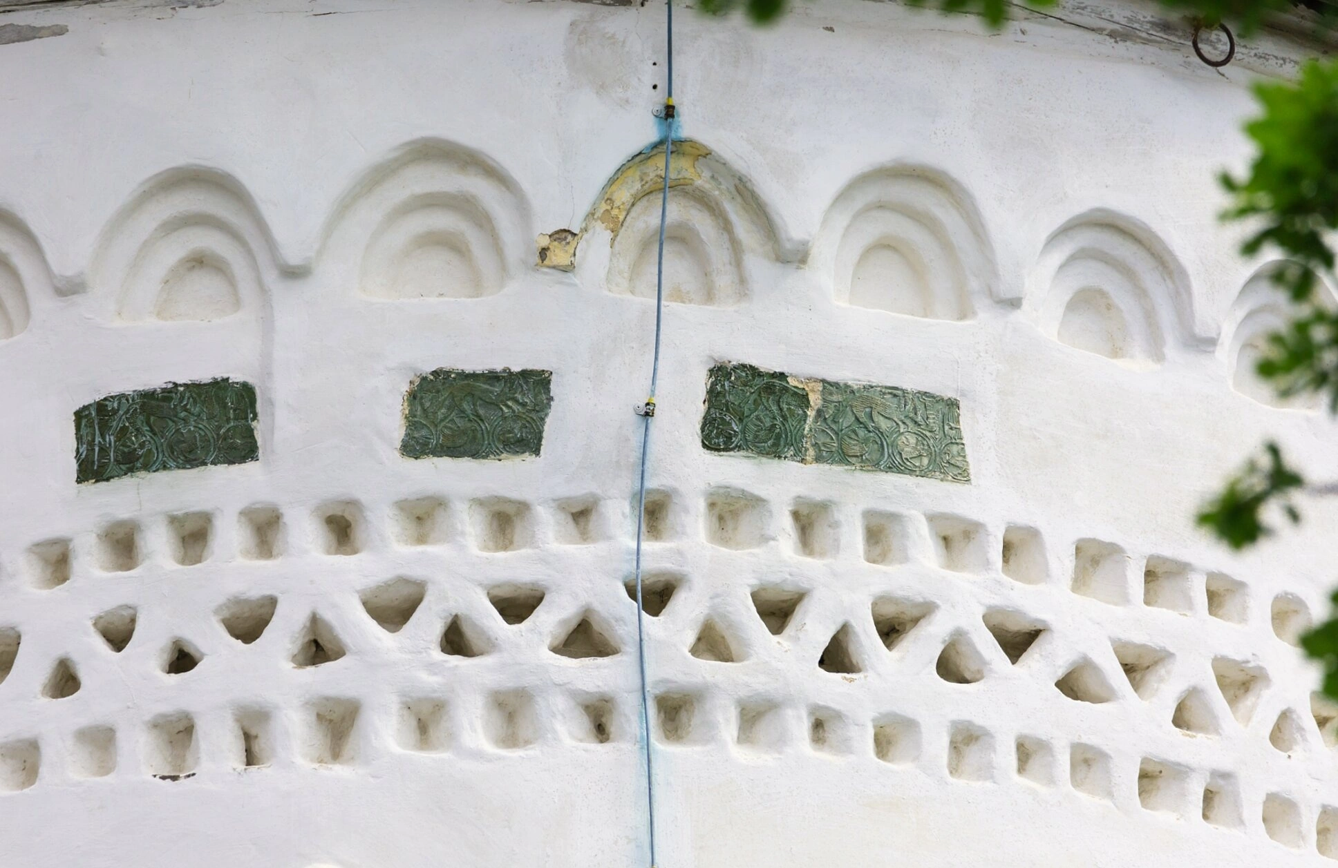 Особого внимания заслуживают вставки из зелёных поливных керамических изразцов, вписанные в аркатуру. Эти керамические элементы, имеющие глазурованную поверхность и зачастую геометрический или растительный орнамент, являются отличительной чертой псковского церковного декора XV–XVI столетий. Они вносили в монументальный облик храма яркий цветовой акцент, символизирующий райскую красоту и вечную жизнь, а также демонстрировали высокое мастерство местных гончаров.