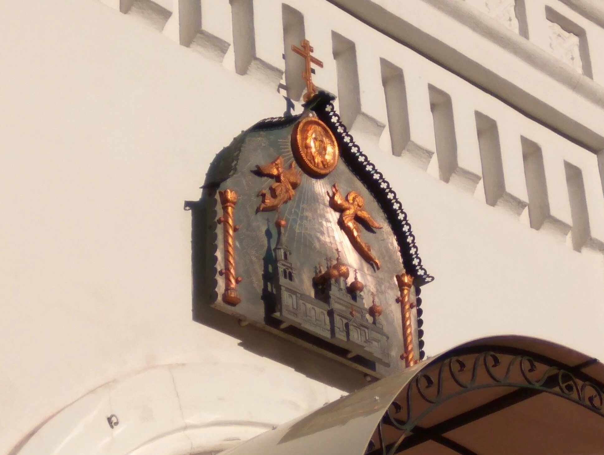 По обе стороны от центрального медальона симметрично размещены фигуры ангелов с распростёртыми крыльями. Их присутствие в декоре подчёркивает святость места и предназначение храма как дома Божия. Ангелы-хранители являются неотъемлемой частью православной иконографии и часто присутствуют в убранстве храмов. Венчает всю композицию традиционный православный крест, являющийся символом спасения и искупительной жертвы Христа.