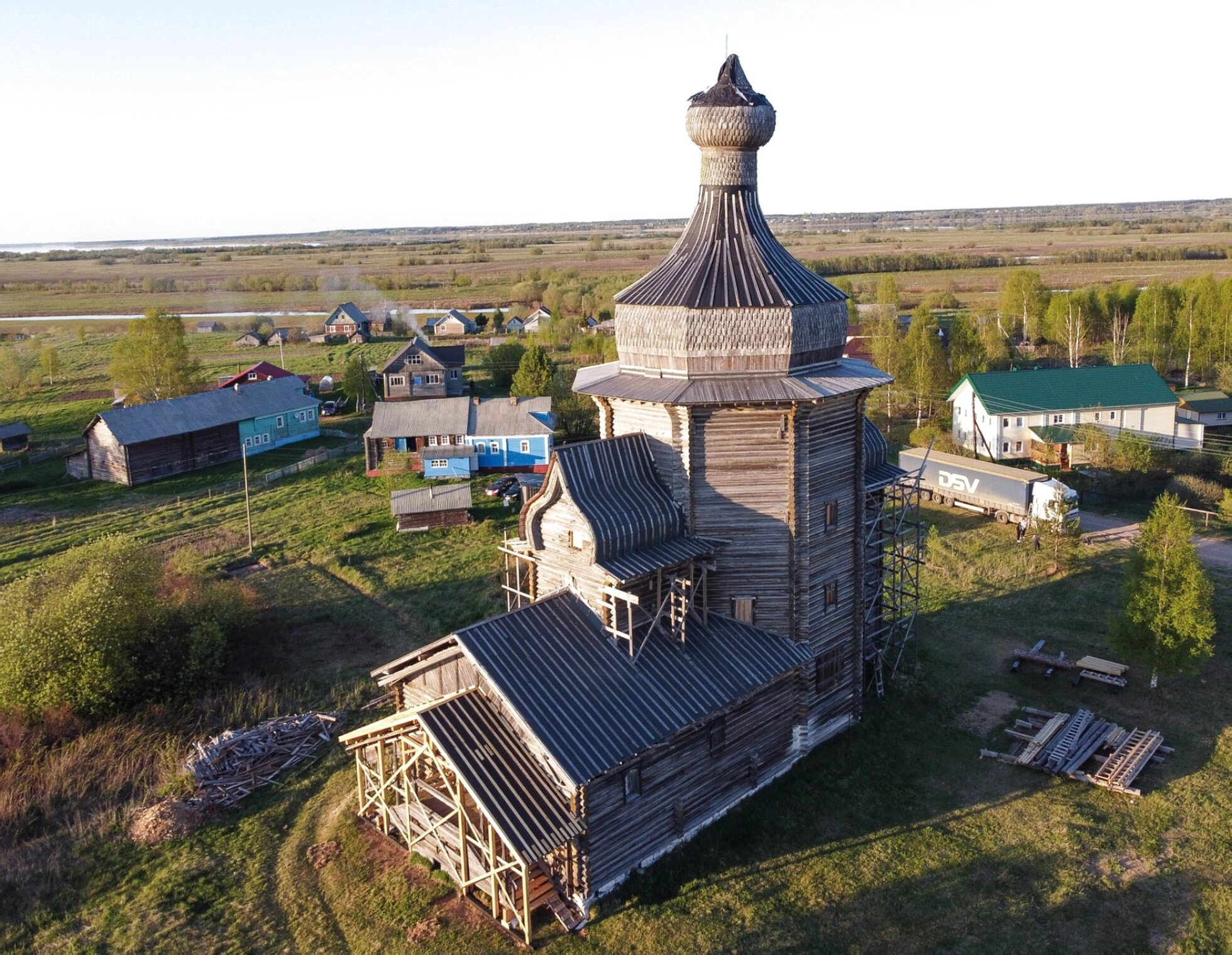 Церковь окружает характерный сельский пейзаж Русского Севера: на заднем плане виднеются традиционные деревянные дома, составляющие единый архитектурный ансамбль с храмом. Местность отличается равнинным характером с невысокой растительностью. Присутствие автомобиля с логотипом транспортной компании указывает на проведение восстановительных работ.