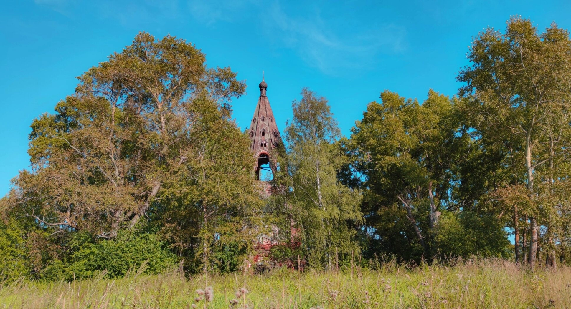 Фотография передает атмосферу духовного уединения и благоговейной тишины, характерную для сельских православных храмов. Отсутствие людской суеты на снимке позволяет сосредоточить внимание на архитектурных особенностях колокольни и ее естественном природном окружении.