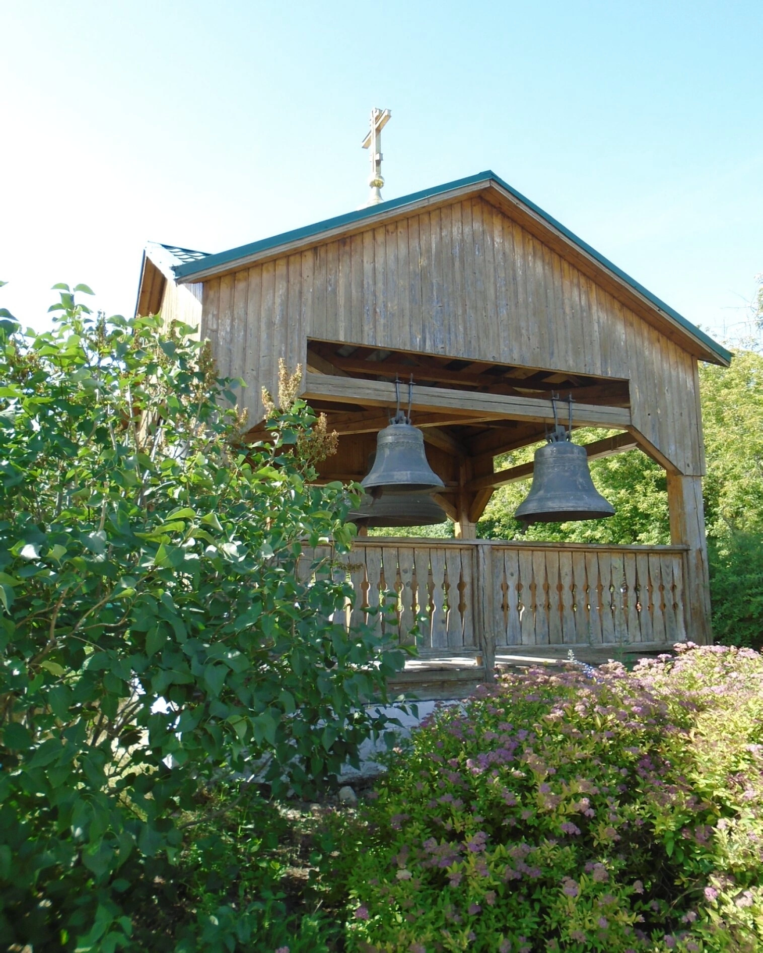 На фотографии запечатлена деревянная колокольня, или звонница, Кизического Введенского мужского монастыря, что располагается в городе Казани. Двухъярусное сооружение увенчано православным восьмиконечным крестом, возносящимся к небу. На её ярусе открытого типа размещены два колокола, призывающие братию и богомольцев на молитвенный труд. Строгая архитектура звонницы гармонично сочетается с окружающим её пейзажем — lushной зеленью деревьев и цветущими кустарниками, создающими атмосферу благодатного уединения и молитвенного покоя.