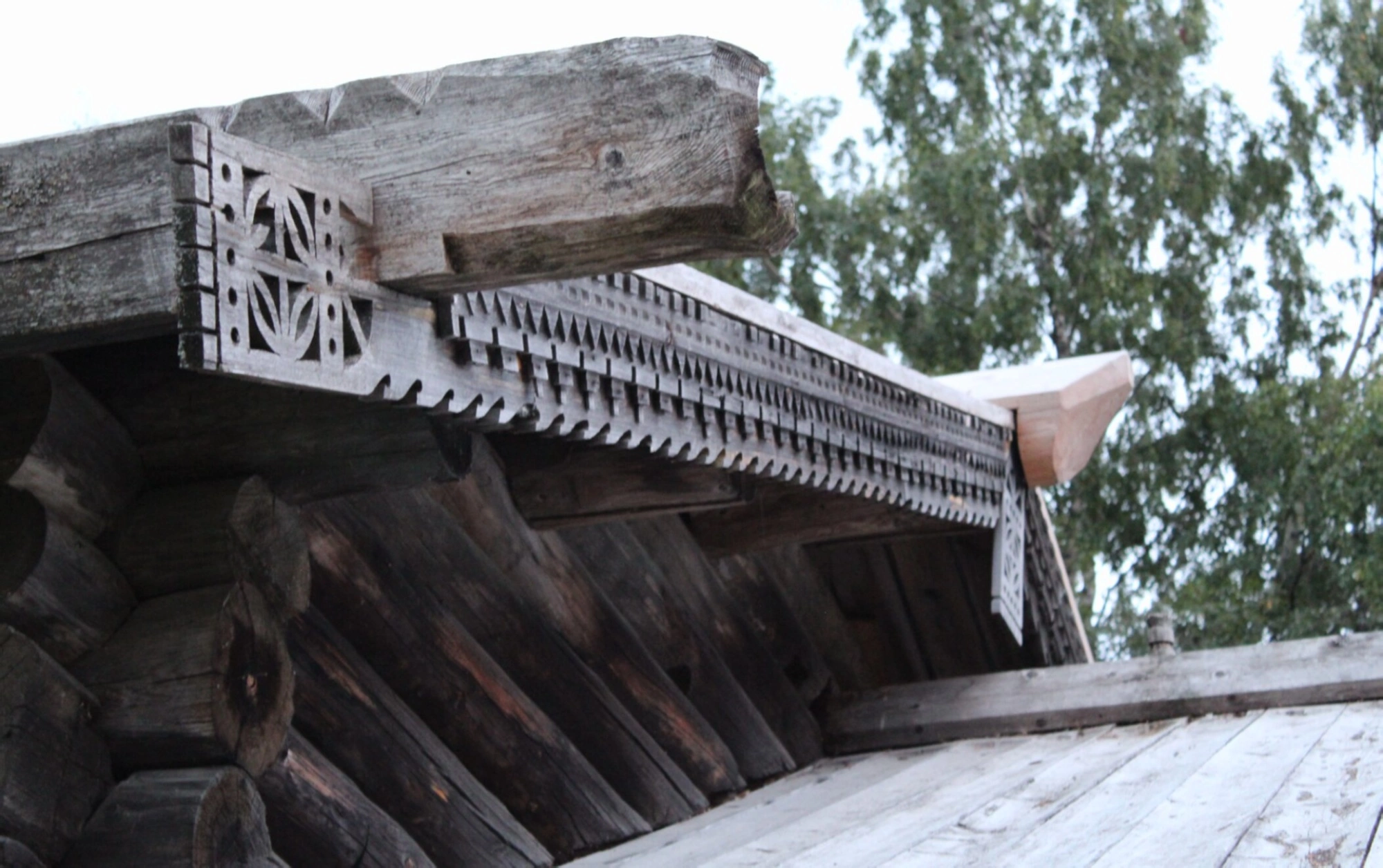 На представленной фотографии запечатлен фрагмент благолепного украшения церкви во имя преподобного Александра Свирского, что располагается в карельском селении Космозеро. Вниманию зрителя открывается дивный образец традиционного русского деревянного зодчества, а именно — искусно выполненный резной орнамент, венчающий святыню.