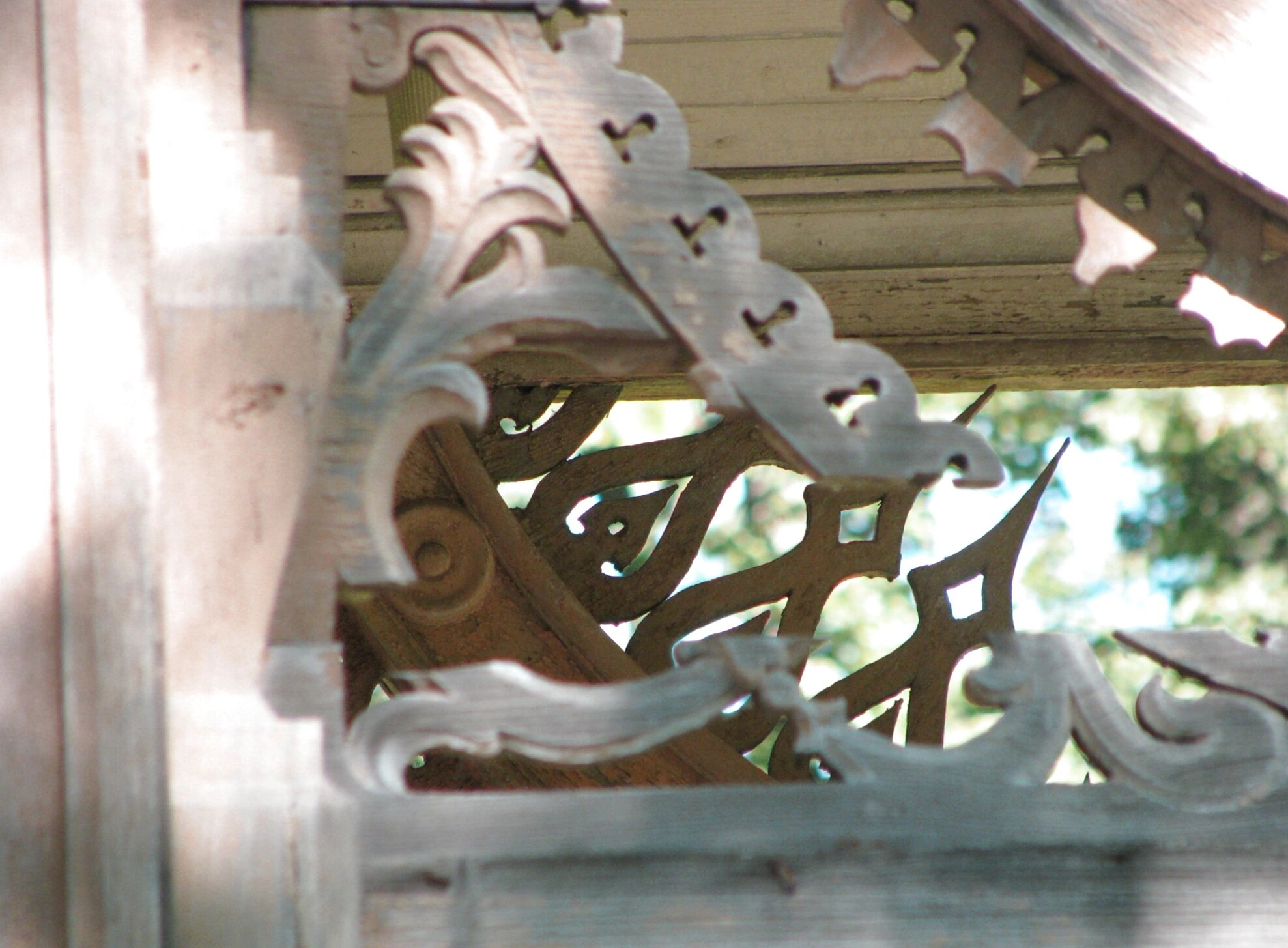 Деревянные детали карниза или наличника, представленные на снимке, выполнены из светлых пород дерева и несут на себе следы благородного старения. Глубокие тени подчеркивают объемность работы и искусную технику исполнения. Сквозь прорези в резном декоре просматривается природное окружение храма - зеленые деревья и небесная лазурь, что создает символическое единение творения рук человеческих и Божьего мира.