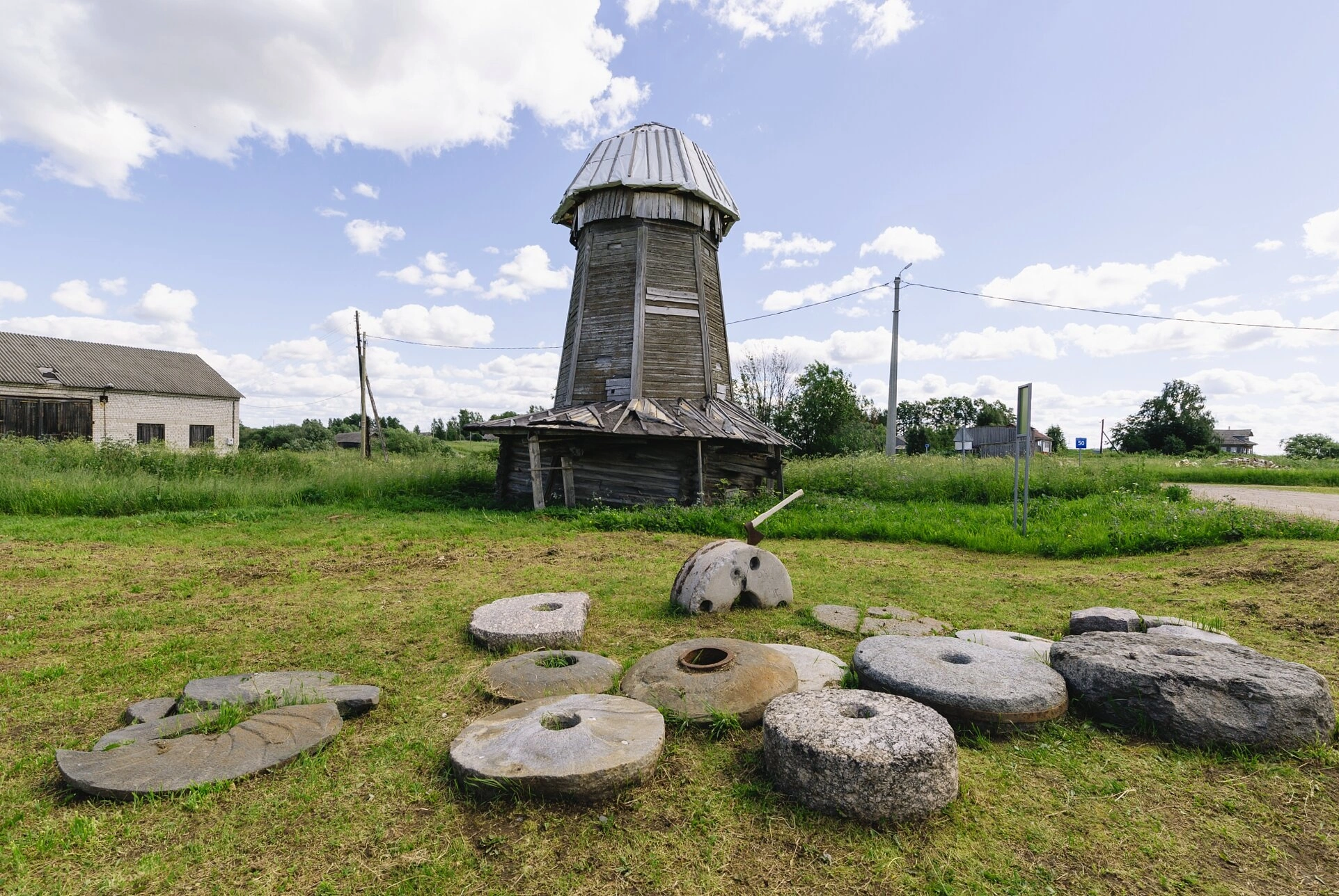 Рядом с мельницей на траве расположены несколько старинных жерновов, которые ранее использовались для помола зерна. Эти каменные круги являются свидетельством многовековых традиций мукомольного производства на Русском Севере. Мельница в селе Ломоносово сохранилась как памятник народной строительной культуры и представляет большую историко-архитектурную ценность.