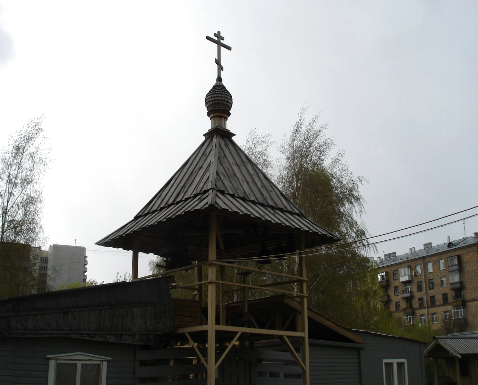 На заднем плане фотографии виднеются кроны деревьев и элементы городской застройки, что подчёркивает гармоничное сочетание святого места с современным городским ландшафтом. Эта скромная, но величественная звонница служит примером традиционного церковного зодчества и продолжает выполнять своё предназначение в самом сердце столицы.