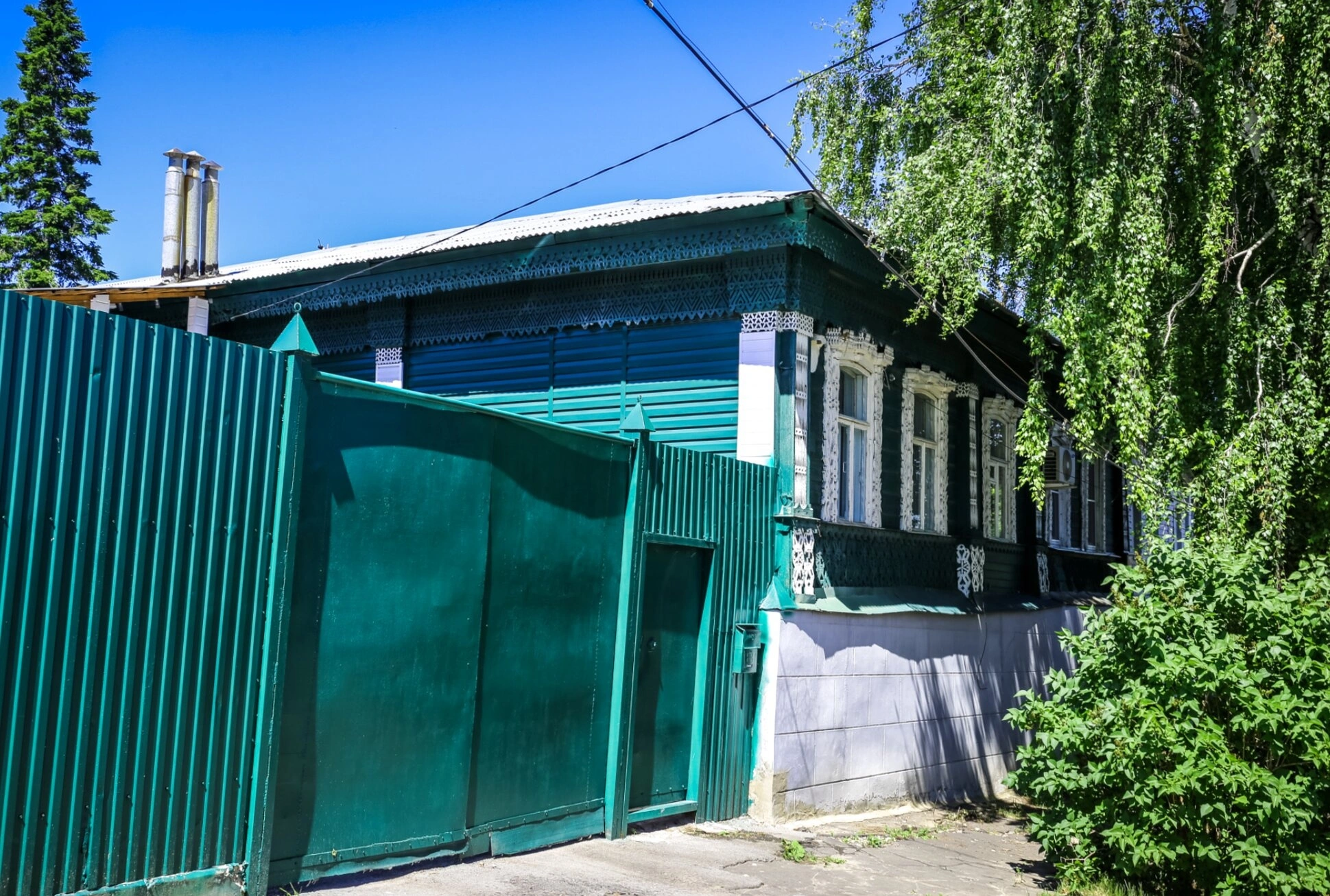 На представленной фотографии запечатлен деревянный дом, окрашенный в зеленый цвет и украшенный белыми резными наличниками. Строение окружено высоким металлическим забором, выполненным в той же цветовой гамме. Архитектурные детали фасада свидетельствуют о традициях русского деревянного зодчества.