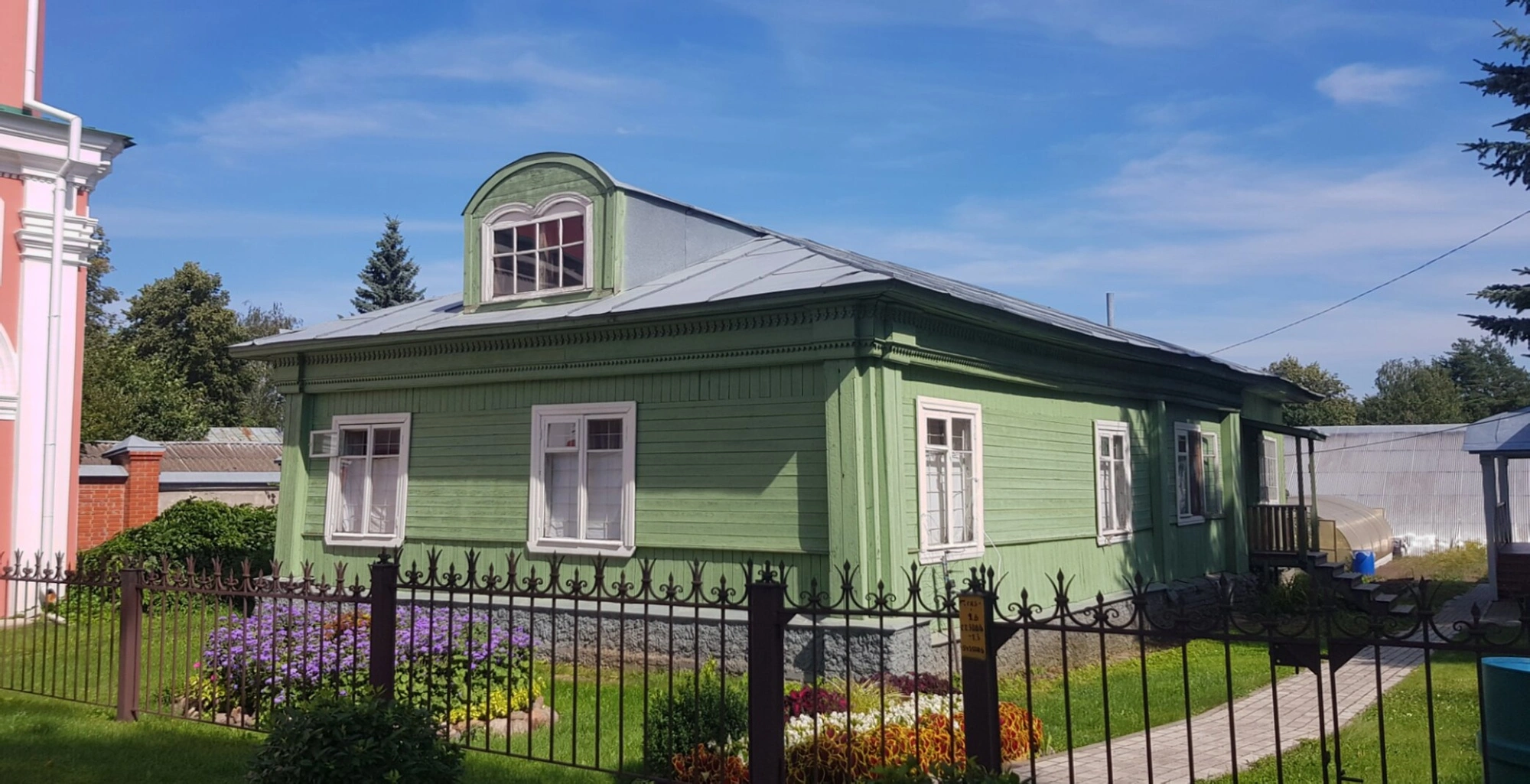 На представленной фотографии запечатлён один из деревянных братских корпусов Покровского Хотькова ставропигиального женского монастыря, расположенного в городе Хотьково Сергиево-Посадского urban округа Московской области. Данное здание, являющееся частью исторического архитектурного ансамбля обители, демонстрирует традиционный для русского монастырского зодчества облик.
