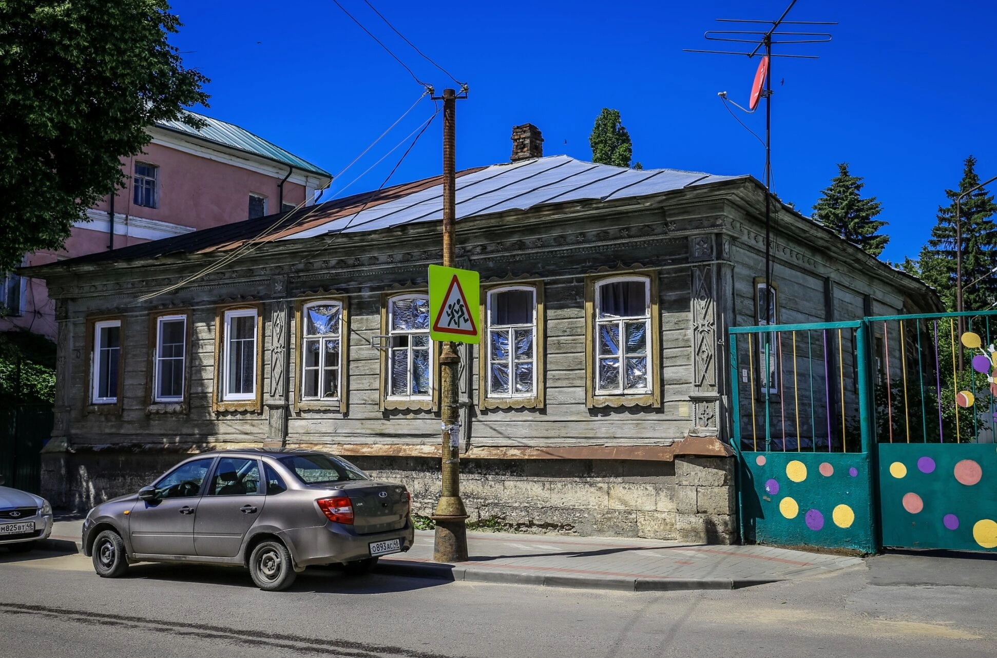 На представленной фотографии запечатлен старинный деревянный дом, расположенный в исторической части города Ельца. Объект представляет собой образец традиционной деревянной архитектуры, характерной для застройки русских городов. Дом выполнен из дерева и покрыт серой кровлей, что придает ему особый колорит и узнаваемость.