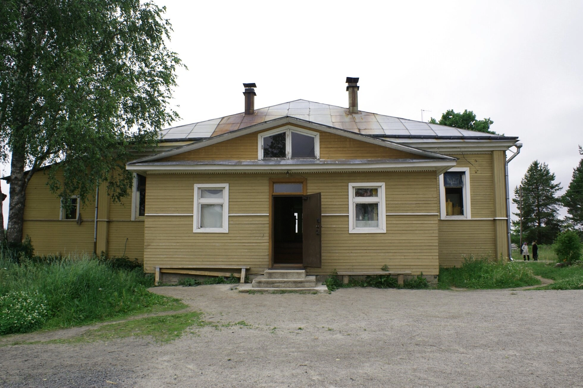 Центральный вход подчёркнут открытой дверью, символически приглашая верующих в молитвенное пространство. Освещается храм через несколько окон, включая характерное мансардное окно на фронтоне, что является отличительной чертой местной строительной традиции. Храм гармонично вписан в окружающий природный ландшафт Карелии: грунтовая тропа ведёт к его threshold, вокруг простирается зелёный травяной покров, а береза и хвойные деревья, виднеющиеся на заднем плане, подчёркивают единение святой обители с северной природой.