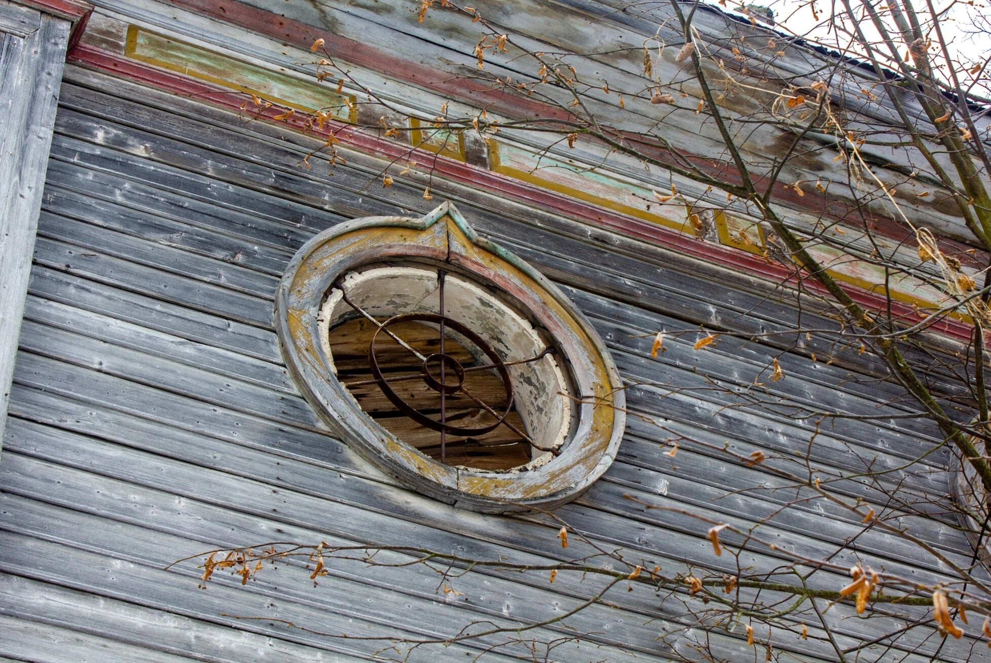 На представленной фотографии запечатлена архитектурная деталь северного фасада Спасо-Преображенской церкви, расположенной в деревне Сухаренки Городецкого района. В центре композиции находится декоративное круглое окно-люкарна, характерное для традиционного русского храмового зодчества. Оконный проём украшен изящным обрамлением, сохранившим следы первоначальной полихромной окраски в светло-желтых, голубых и белых тонах, ныне несколько выцветших под воздействием времени и природных стихий.