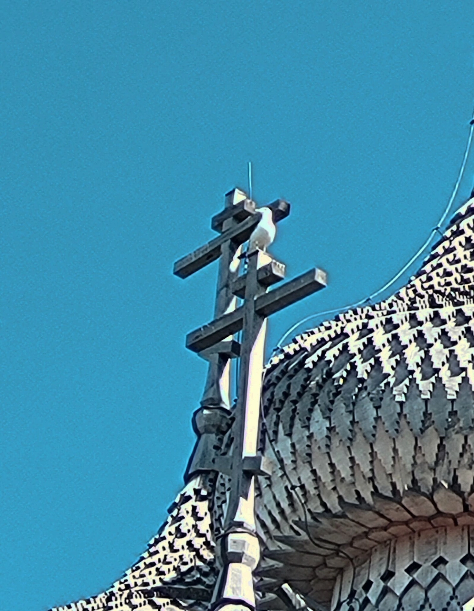 В центре композиции расположен крест — символ христианской веры и спасения. Фотография позволяет рассмотреть детали его крепления к деревянному основанию купола. Согласно церковному преданию, многоглавие храма, напоминающее огненные языки, символизирует свет Преображения, сошедший на апостолов на горе Фавор. Сама церковь, возведённая в 1714 году на месте сгоревшего предшественника, является летним, неотапливаемым храмом и освящена в честь этого евангельского события.