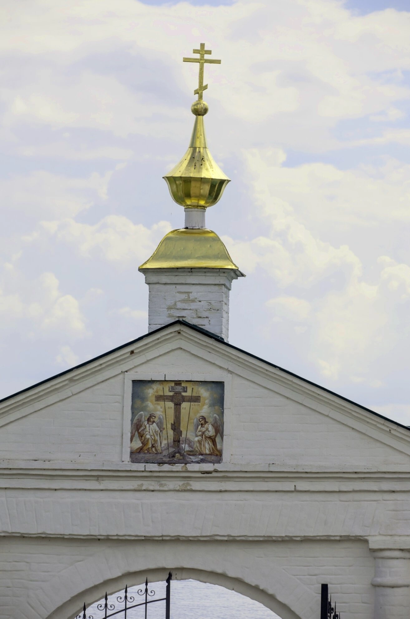 На представленной фотографии запечатлены уникальные элементы архитектуры Церкви Рождества Пресвятой Богородицы, расположенной в старинном селе Катунки Нижегородской области. В верхней части снимка возвышается златоглавый купол, увенчанный традиционным православным восьмиконечным крестом, символизирующим искупительную жертву Спасителя. Под сенью небес купол сияет благодатным светом, устремляя взор верующих к горнему миру.