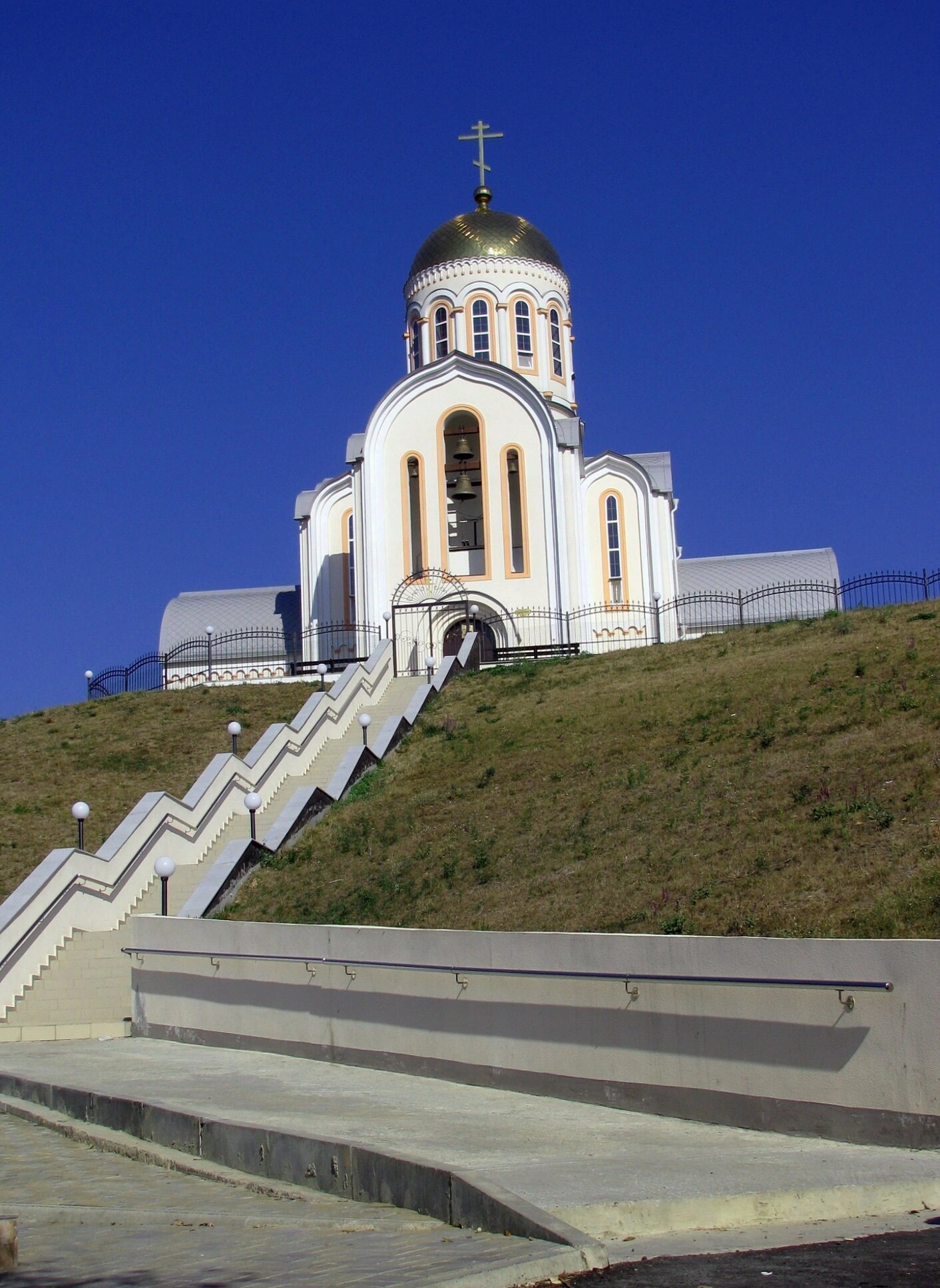 Фасадная стена, уходящая вверх за пределами кадра, окрашена в светлый, тёплый оттенок. В ней расположено окно, защищённое металлической решёткой. Окружающий храм мир представлен элементами городского пейзажа: бетонным тротуаром, дорогой, а вдали — зеленью деревьев и крышами других строений. Дорожный знак на столбе указывает на современный контекст, в котором существует этот памятник церковной архитектуры.