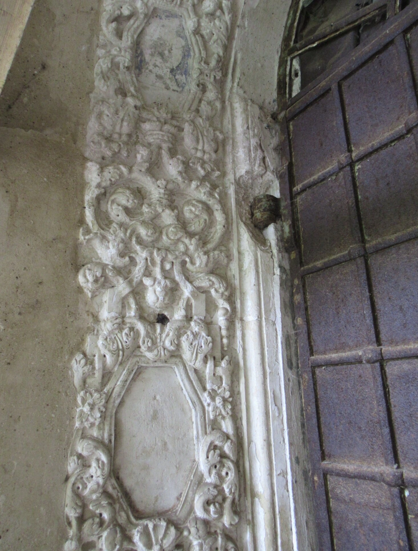 Лепнина, украшающая стены и потолок храма, выполнена в лучших традициях русской церковной архитектуры XIX столетия. Внимательный взгляд различит сложный растительный узор с акантами и стилизованными цветами, а также геометрические вставки восьмиугольной формы, которые в православной символике олицетворяют вечность и небесный свод. Несмотря на повреждения, осыпающуюся штукатурку и утраты, сквозь слои времени проступает былое великолепие и мастерство безвестных художников-керамистов, трудившихся во славу Божию.