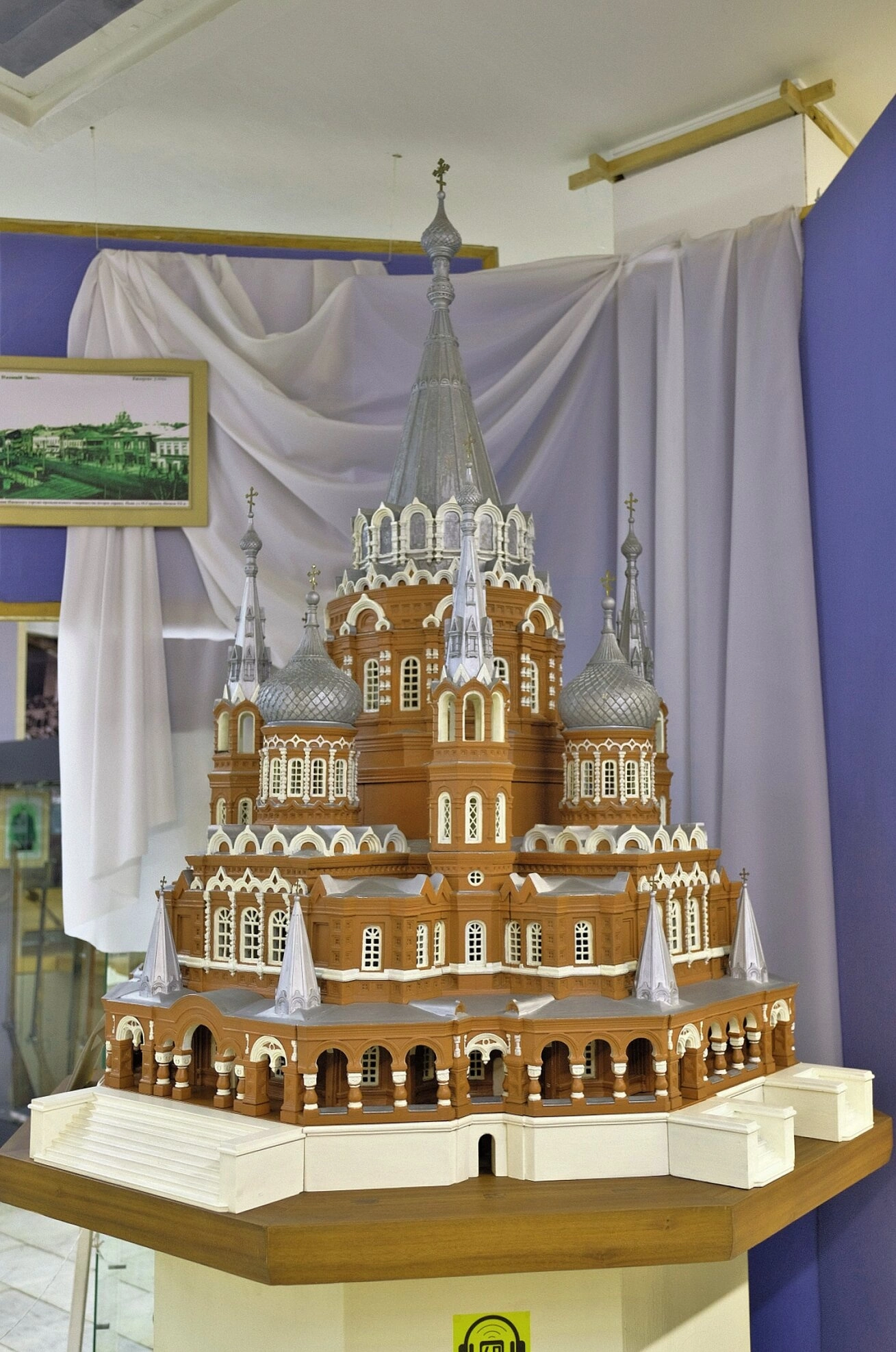 Данный экспонат имеет не только историко-культурную, но и духовную ценность, напоминая о многовековых традициях православной веры на удмуртской земле и о торжестве её восстановления в наши дни. Фотография зафиксировала этот уникальный макет, позволяя зрителю оценить монументальность и красоту одного из самых значительных храмовых сооружений Уральского региона.
