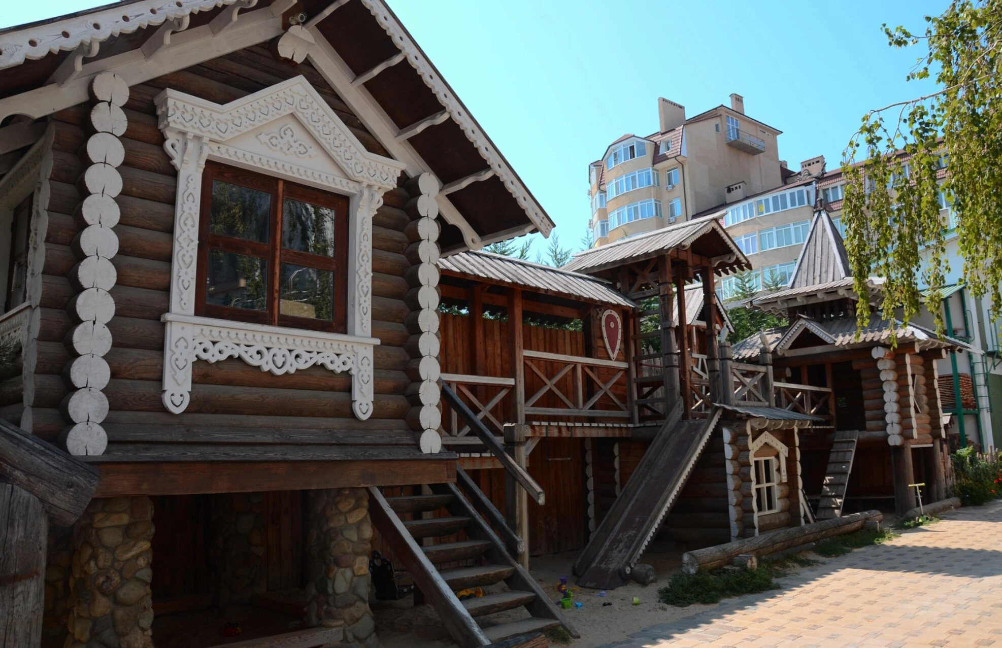 Центральным элементом композиции является двухэтажное сооружение из оцилиндрованного бревна, украшенное резными наличниками и увенчанное двускатной кровлей. Архитектурный облик напоминает древние православные часовни и монастырские строения, что создаёт особую духовную атмосферу для детских игр. Первый этаж сооружения покоится на каменных опорах, что придаёт всей конструкции дополнительную монументальность.