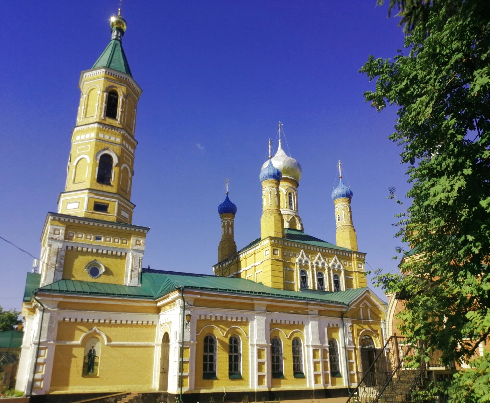 Кровли храмовых построек покрыты материалом зелёного цвета, что добавляет комплексу нарядности и живописности. На переднем плане фотографии видна ухоженная территория монастыря, а справа в кадр попадает крона дерева с пышной зелёной листвой, которая оттеняет яркость храмовых стен. Фотография сделана в ясный солнечный день, что подчёркивается чистым голубым небом, служащим идеальным фоном для светлого и радостного образа православной святыни.