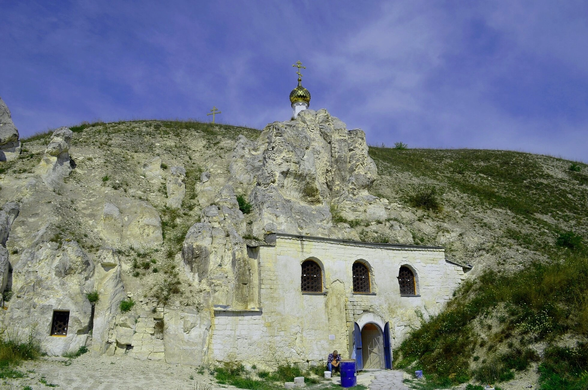 На представленной фотографии запечатлён уникальный памятник православной культуры и архитектуры — пещерный храм Рождества святого Иоанна Предтечи, являющийся частью Дивногорского Свято-Успенского мужского монастыря. Святая обитель располагается в живописной местности на территории музея-заповедника «Дивногорье» в Воронежской области, на правом берегу реки Дон.