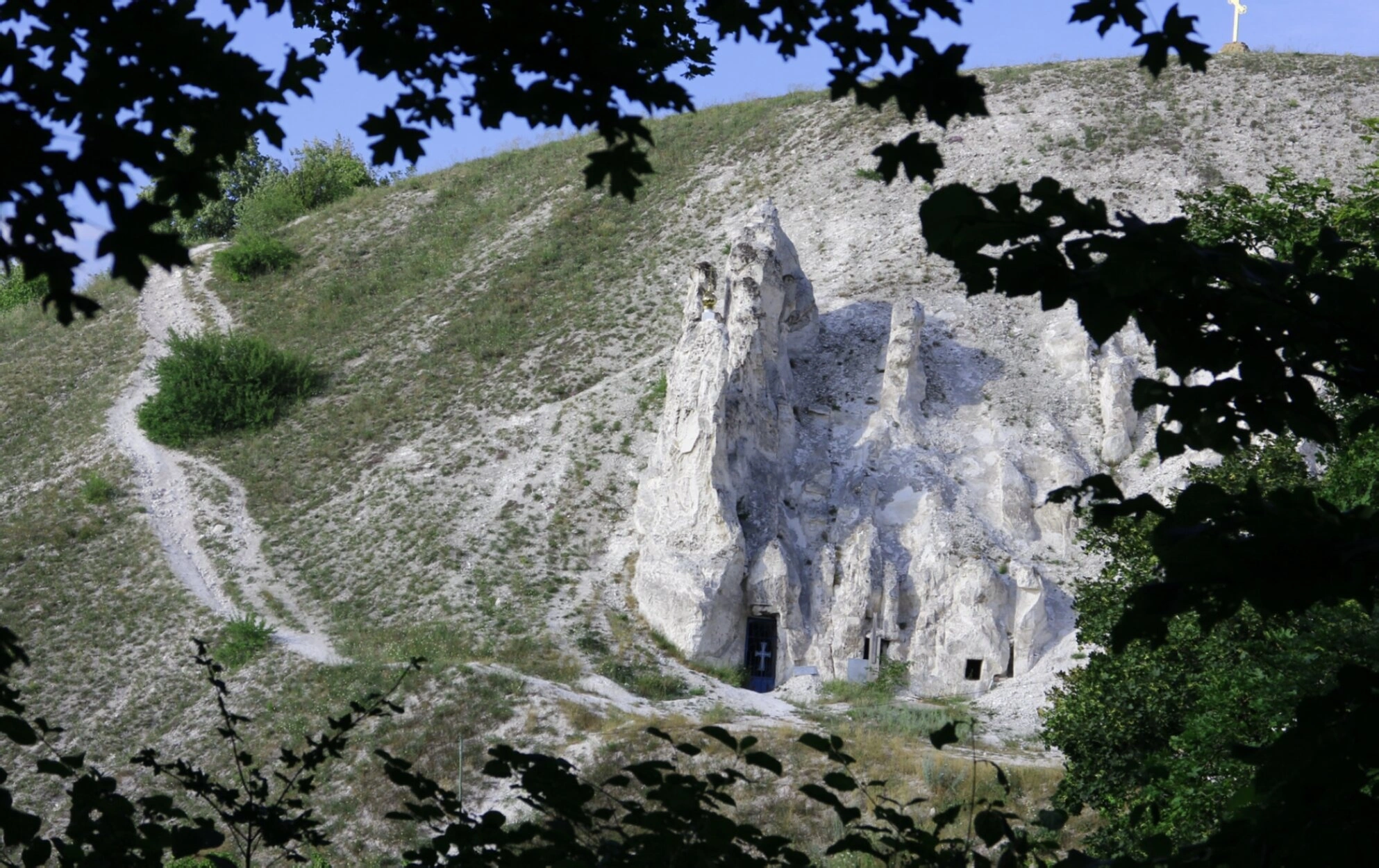 Главной достопримечательностью обители, изображённой на снимке, являются пещерные храмы и кельи, искусно высеченные в толще мелового массива. В центре кадра виднеется вход в одну из пещер, увенчанный православным крестом — символом веры и спасения. Белоснежные меловые стены, сохраняющие прохладу даже в самый сильный зной, создают особую молитвенную атмосферу уединения и сосредоточенности.