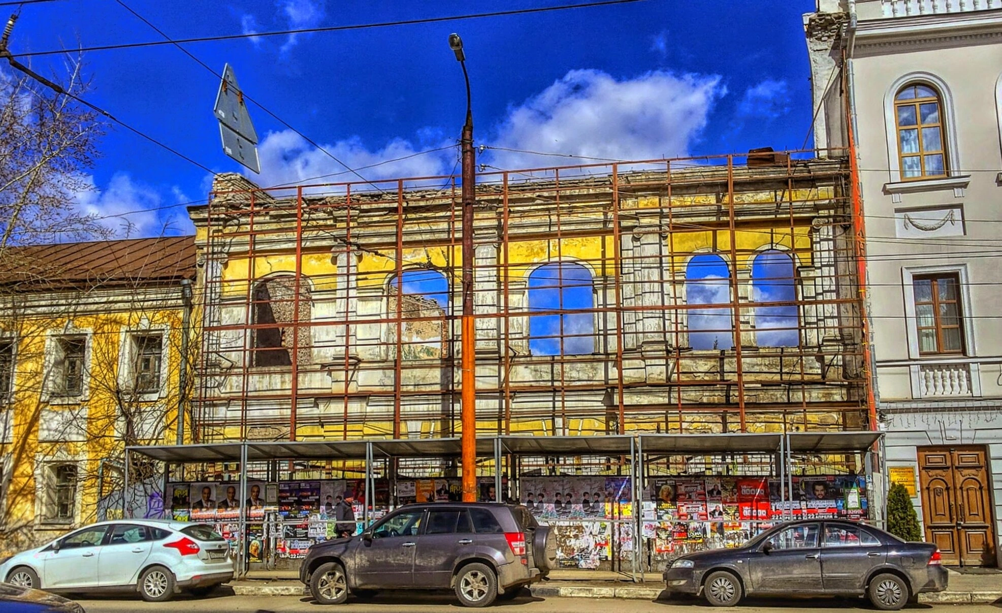 На первом этаже здания, под строительными конструкциями, просматриваются многочисленные афиши и объявления, что свидетельствует о продолжающейся социальной активности в нижних помещениях даже в период ремонтных мероприятий. Припаркованные рядом автомобили современного образца создают временной контраст, подчеркивая связь исторического наследия с настоящим временем.