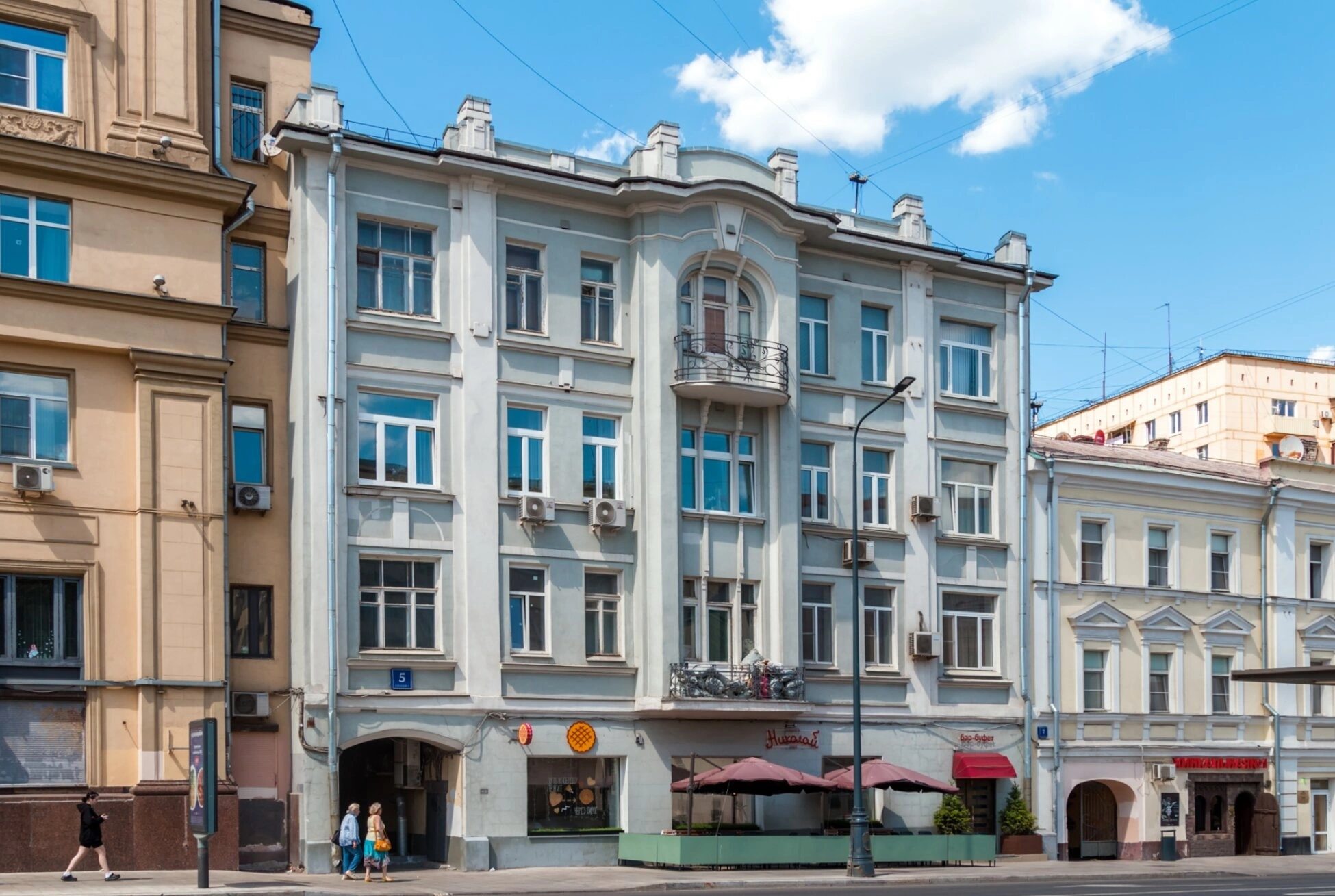 На представленной фотографии запечатлён исторический доходный дом Николая Козлова, расположенный в Москве по адресу Старая Басманная улица, дом 5. Это здание является ценным образцом московской архитектуры и охраняется государством как объект культурного наследия.