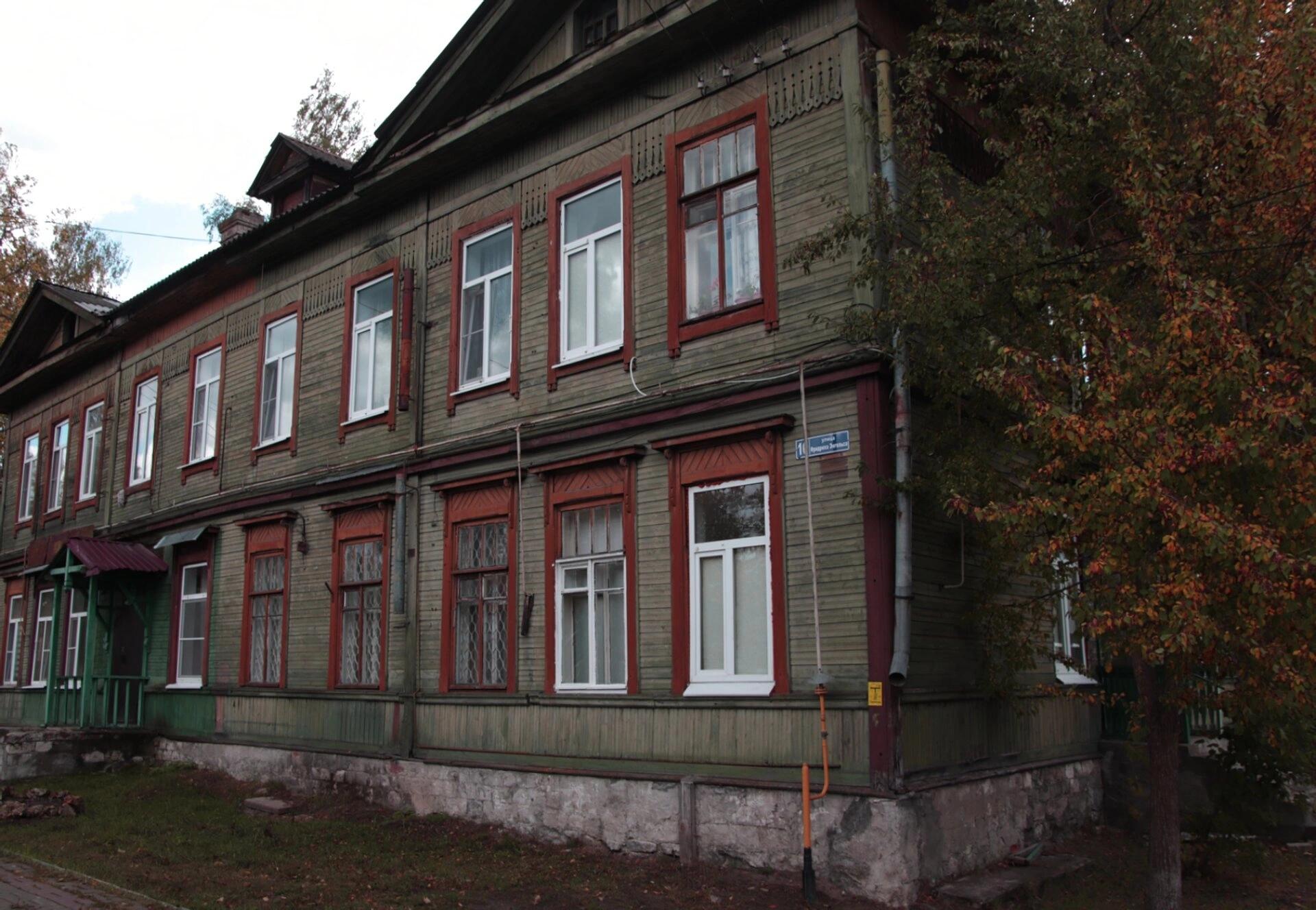 На представленной фотографии запечатлен исторический дом Барановского, расположенный в городе Рошаль Шатурского района Московской области. Данный архитектурный объект представляет собой двухэтажное деревянное здание с мансардой, обшитое досками и окрашенное в зеленый цвет.