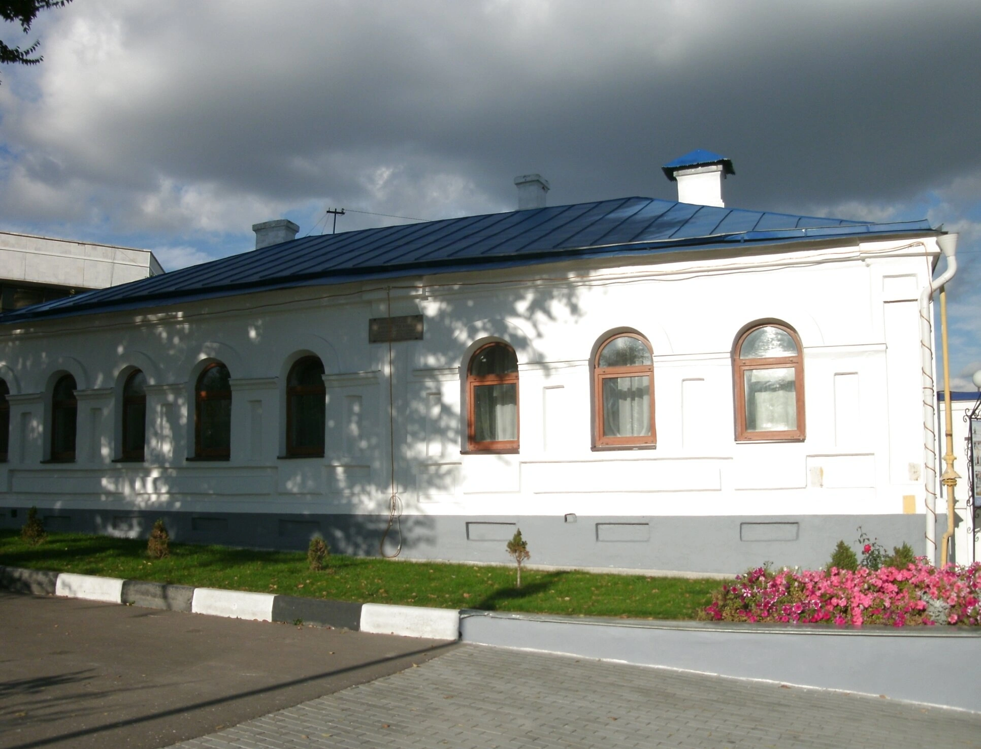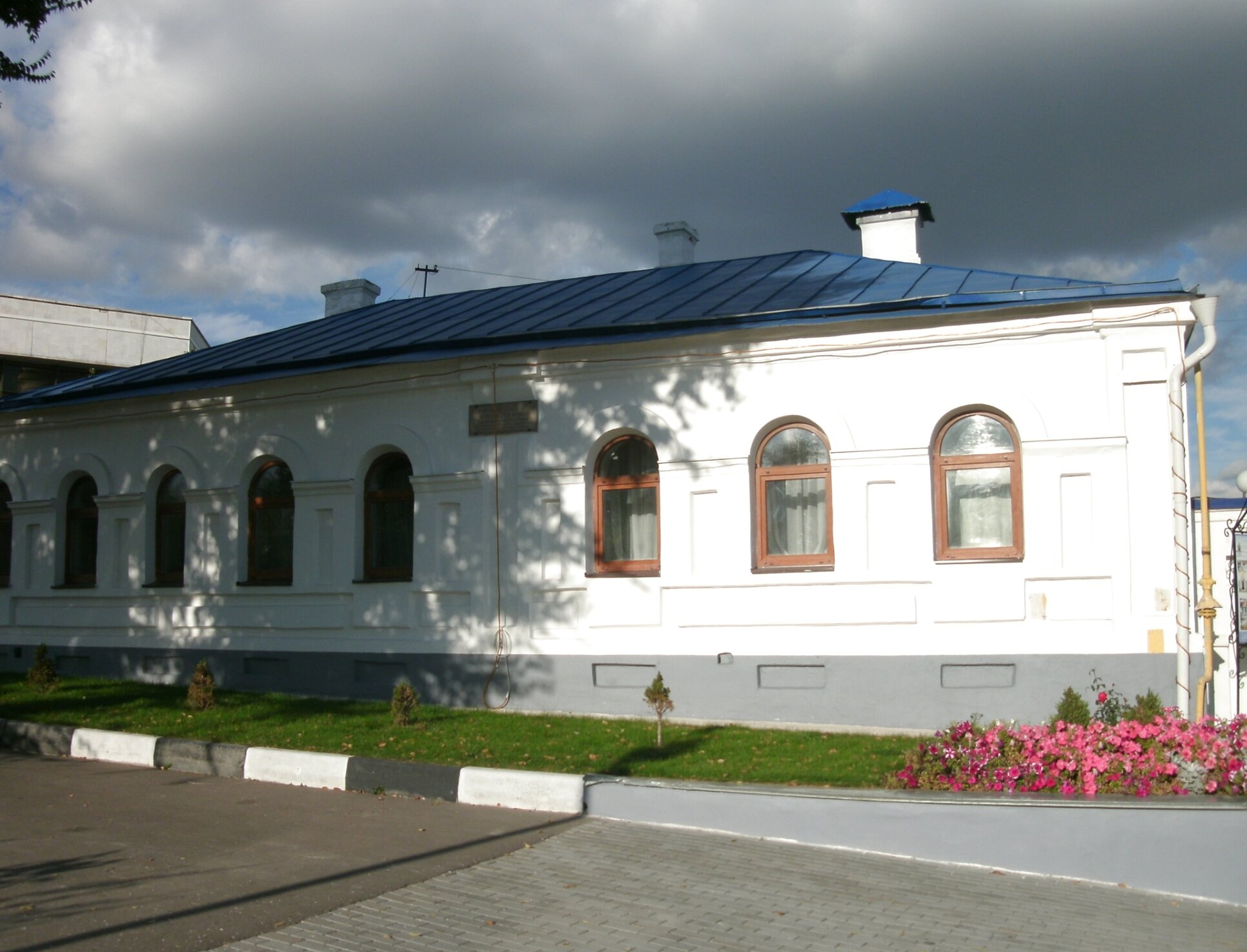 На представленной фотографии запечатлён одноэтажный дом священнослужителей, расположенный на территории Покровского кафедрального собора города Воронежа. Здание, выдержанное в скромном и благолепном стиле, окрашено в чистый белый цвет и увенчано тёмно-синей кровлей, что символизирует чистоту и небесную благодать. Фасад строения украшен рядом арочных окон с добротными коричневыми рамами, через которые в келии и служебные помещения обители проникает божественный свет.