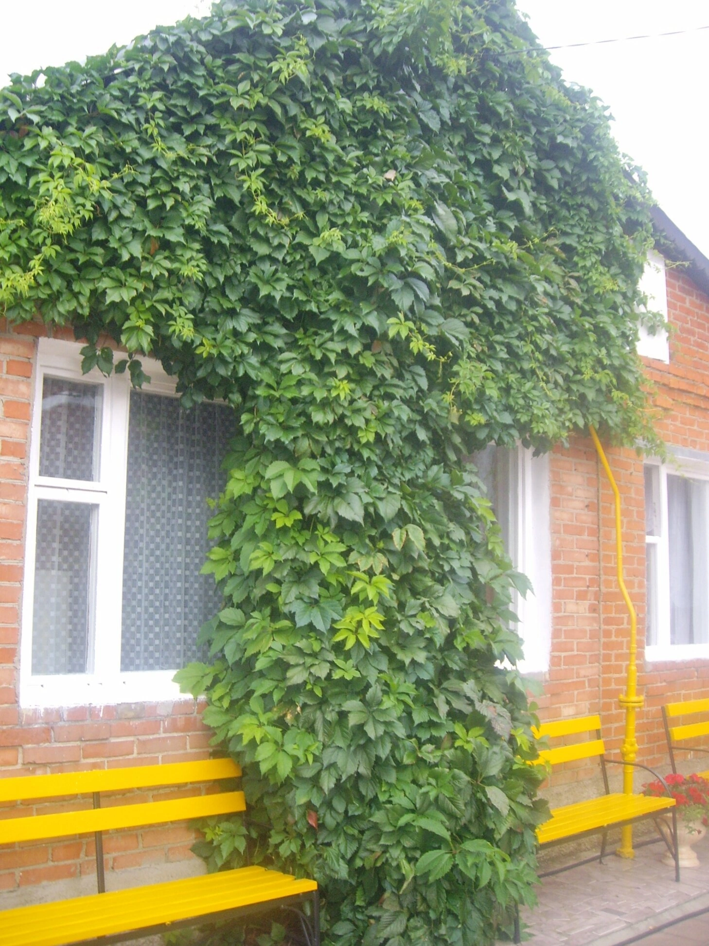 Девичий виноград, или партеноциссус, своими пышными зелёными гирляндами мягко обрамляет архитектурные формы, символизируя собой смиренное служение творения Божия, украшающего мир. Этот дом, находящийся в историческом центре села, является неотъемлемой частью ансамбля, сложившегося вокруг старинного храма, и представляет собой пример благоустройства территории в духе православной традиции, где красота рукотворная дополняется красотой естественной, дарованной Господом.